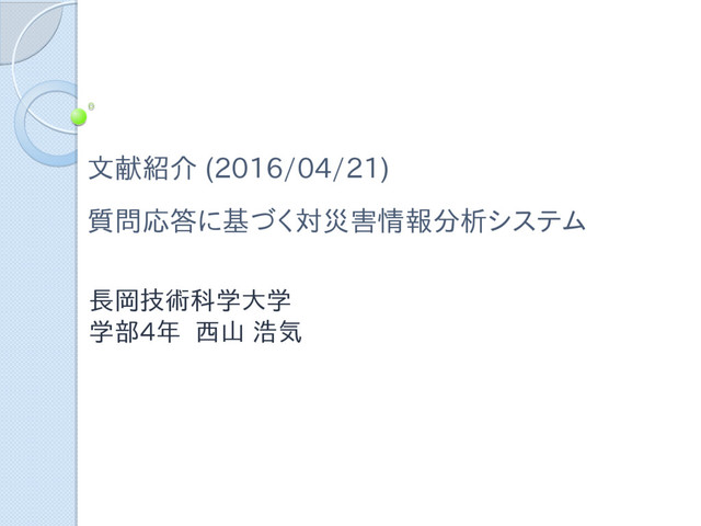 文献紹介 (2016/04/21) 質問応答に基づく対災害情報分析システム 長岡技術科学大学 学部4年 西山 浩気