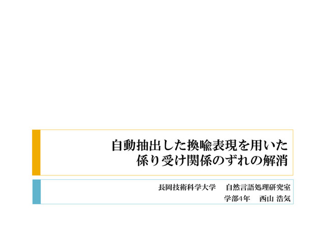 自動抽出した換喩表現を用いた 係り受け関係のずれの解消 長岡技術科学大学 自然言語処理研究室 学部4年 西山 浩気