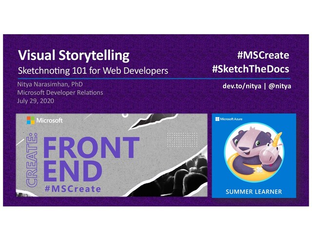 = Tutorial Channel 9 = Video Create Sketchnote Or Zine Make a single-page sketchnote or 8-tile zine that captures the essence of that content! Sketch DOCUMENTATION aka.ms/visual-swa-docs Sketch A TUTORIAL aka.ms/visual-azure-learn Share on Twi<er with #MSCreate #SketchTheDocs Sketch a TALK aka.ms/visual-azure-channel9