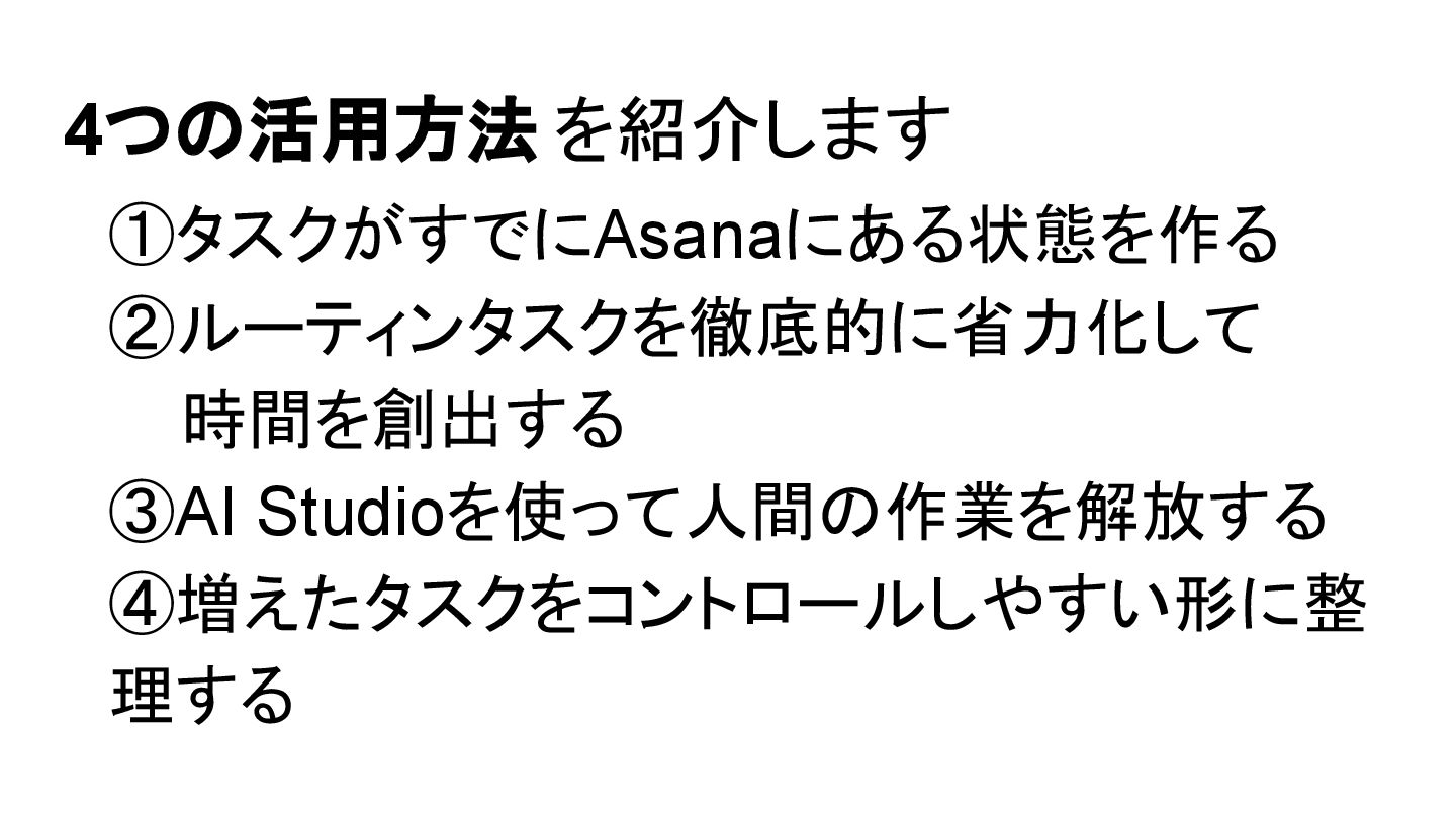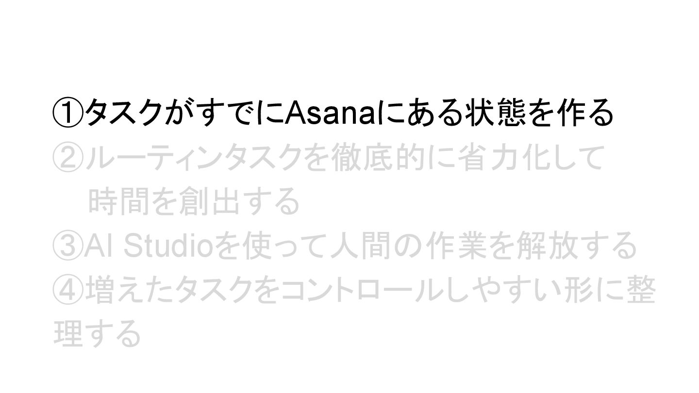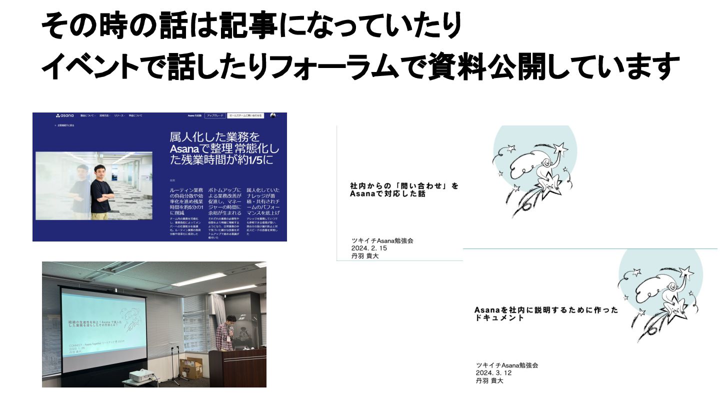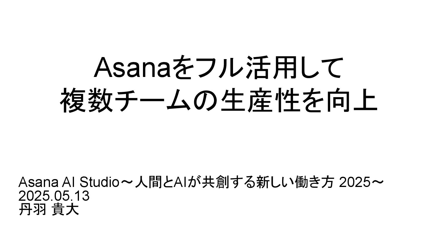 2025年05月13日(火)に開催されたイベント Asana AI Studio〜人間とAIが共創する新しい働き方 2025〜 で Asanaの導入プロセスや作業の自動化や効率化やその成果 などを紹介しました そのスライドを全公開です。 イベント当日の様子は記事になっています。 https://www.work-management.jp/blog/improved-productivity-across-multiple-teams