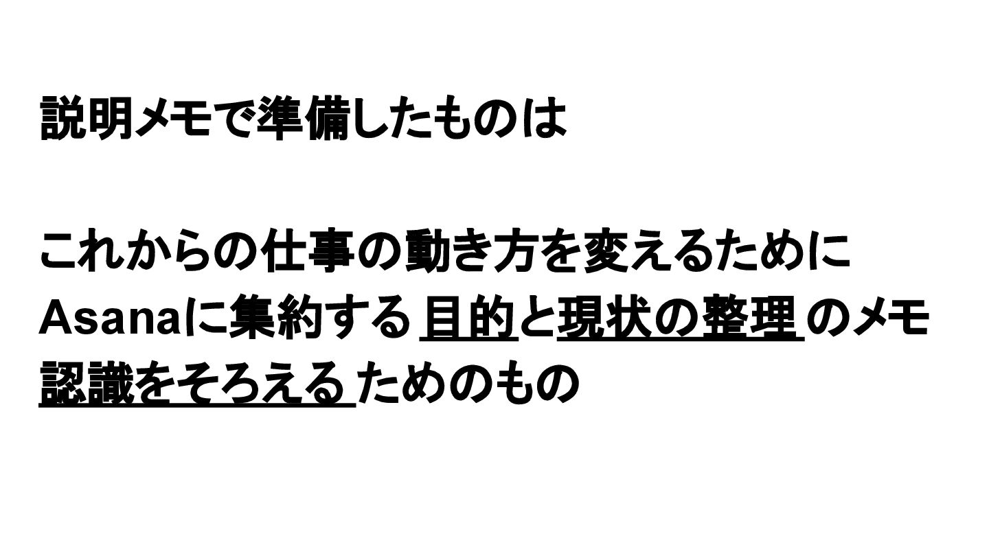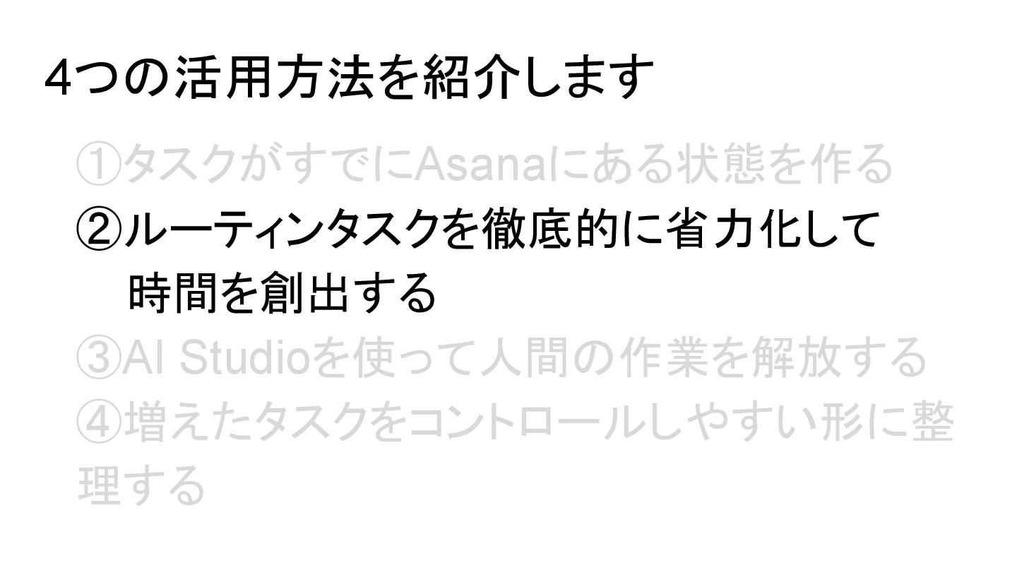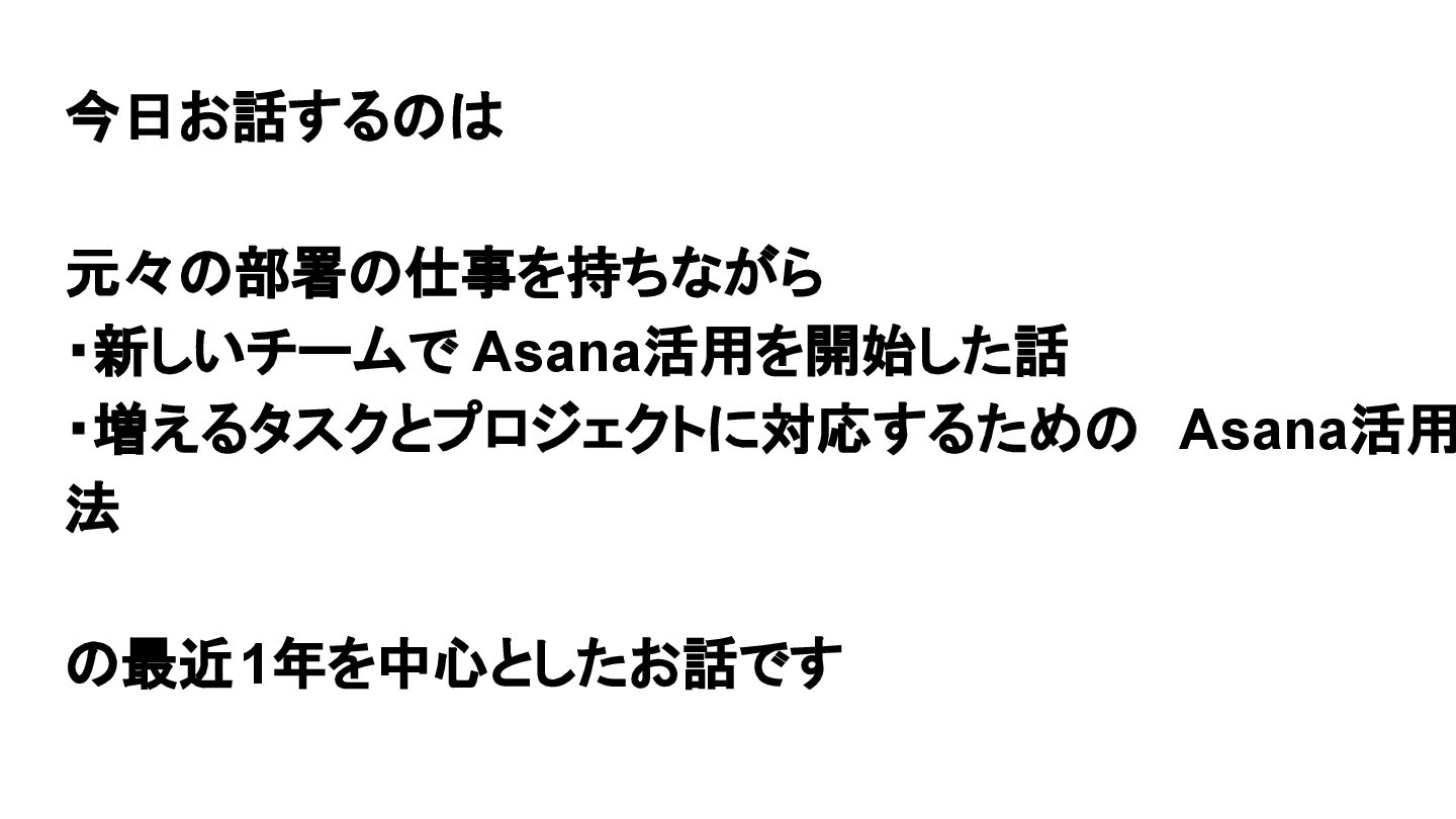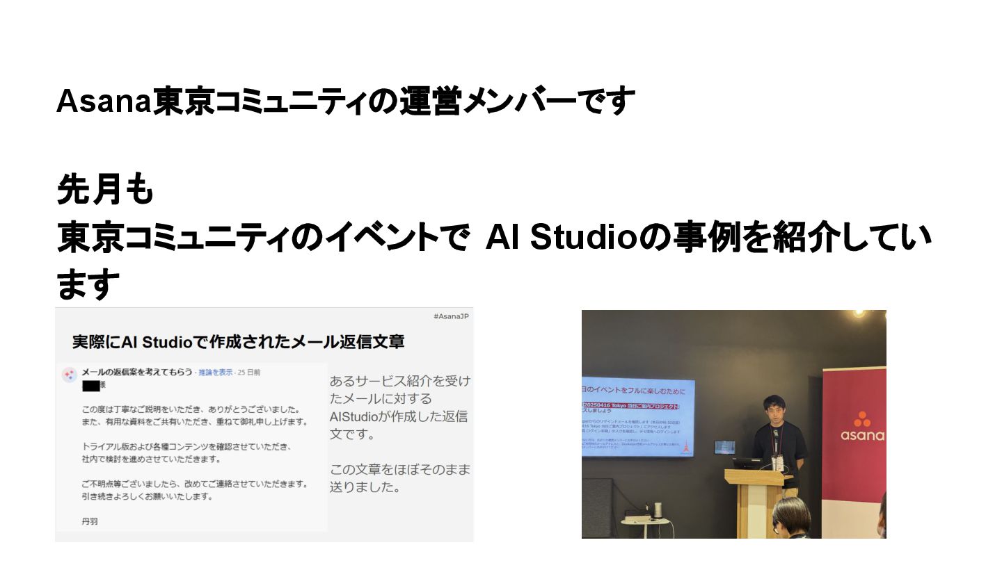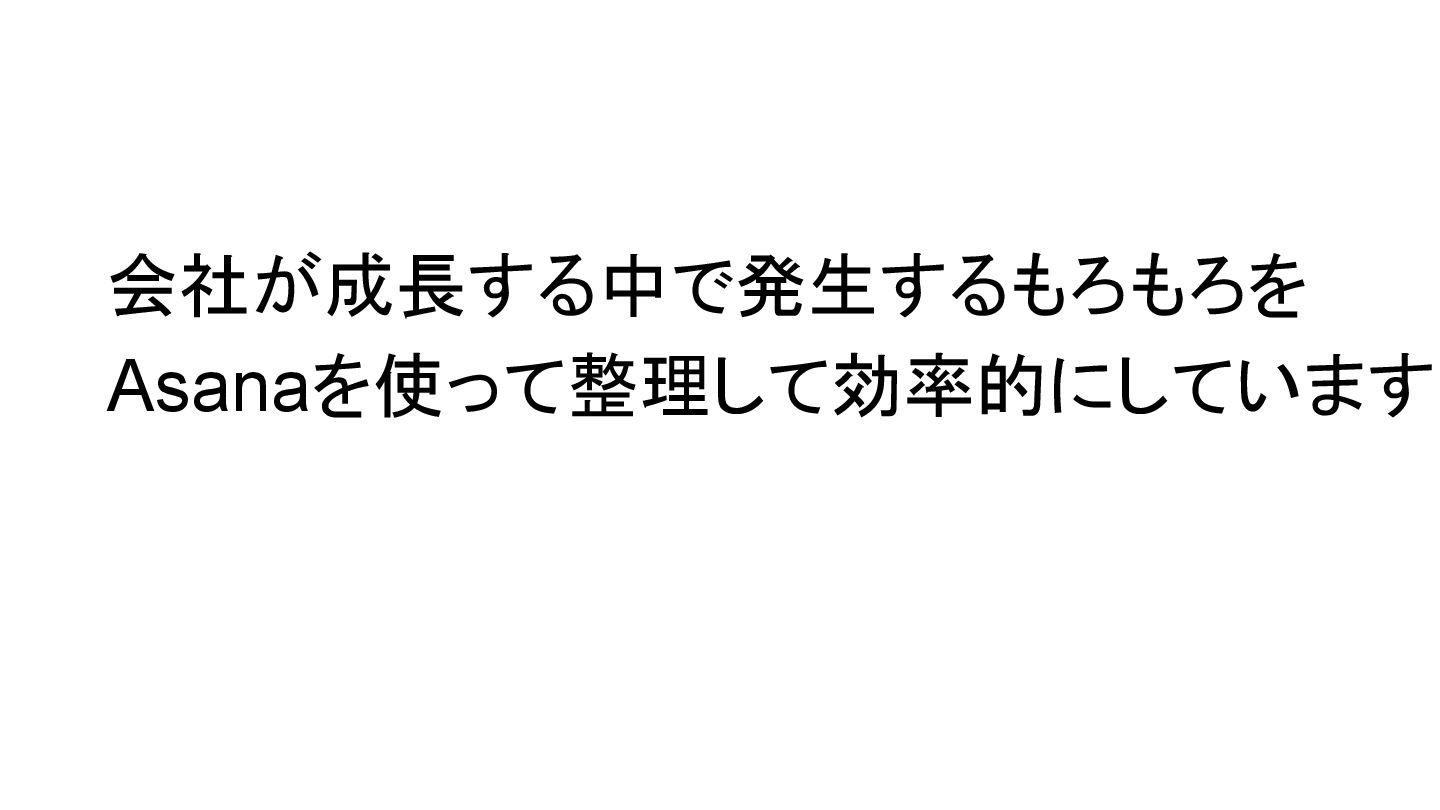 2025年05月13日(火)に開催されたイベント Asana AI Studio〜人間とAIが共創する新しい働き方 2025〜 で Asanaの導入プロセスや作業の自動化や効率化やその成果 などを紹介しました そのスライドを全公開です。 イベント当日の様子は記事になっています。 https://www.work-management.jp/blog/improved-productivity-across-multiple-teams