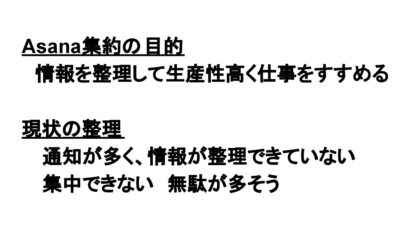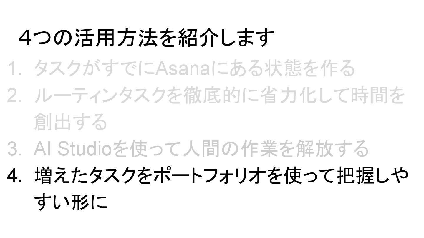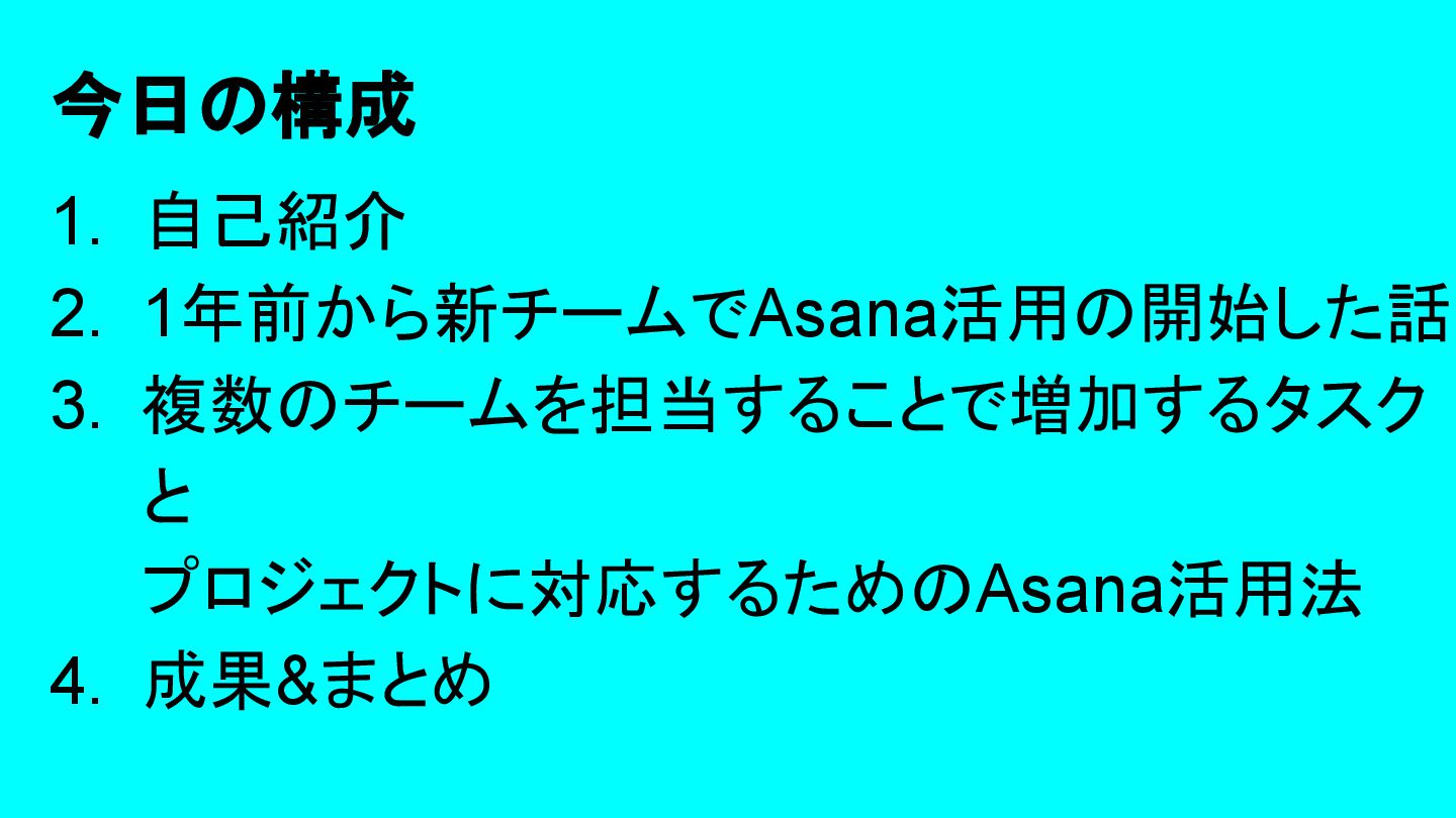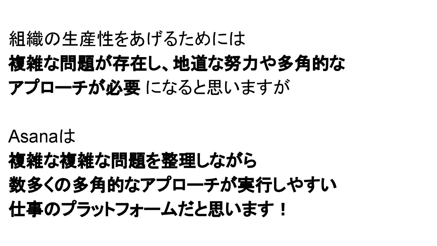 2025年05月13日(火)に開催されたイベント Asana AI Studio〜人間とAIが共創する新しい働き方 2025〜 で Asanaの導入プロセスや作業の自動化や効率化やその成果 などを紹介しました そのスライドを全公開です。 イベント当日の様子は記事になっています。 https://www.work-management.jp/blog/improved-productivity-across-multiple-teams