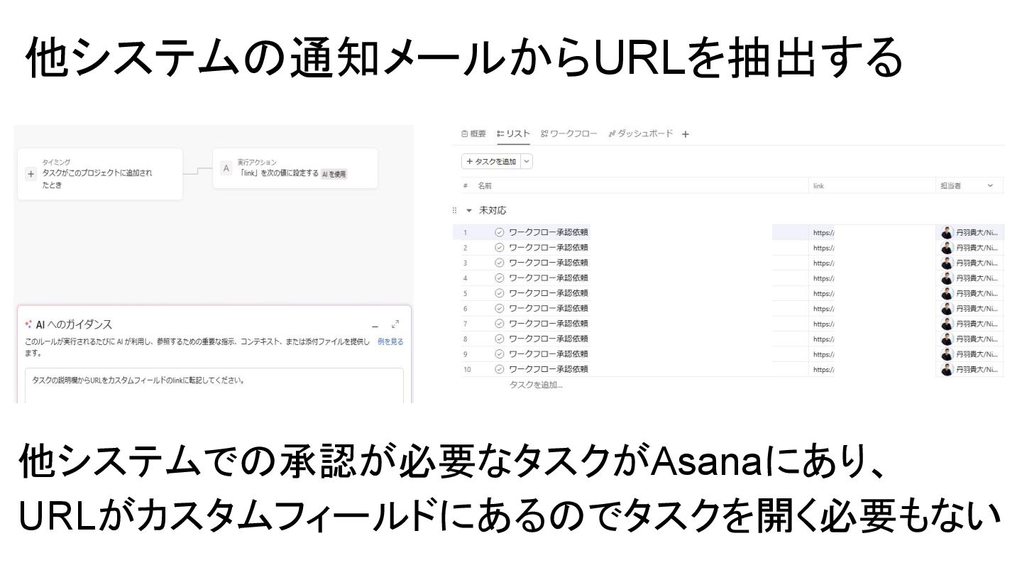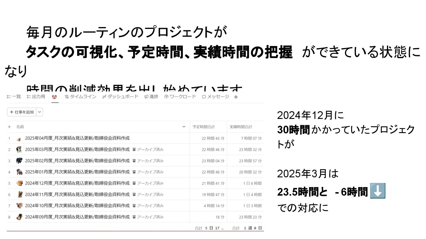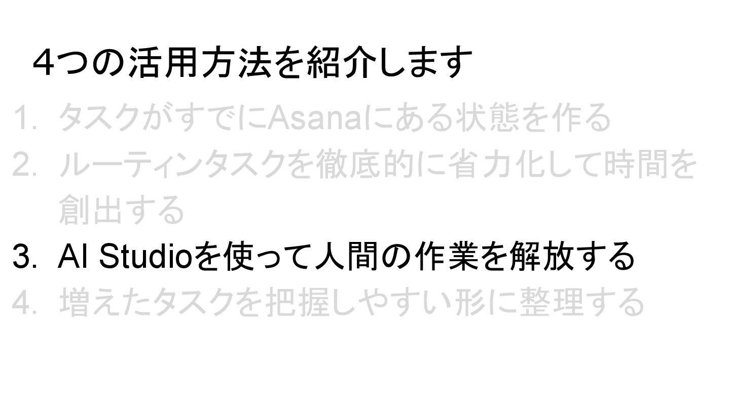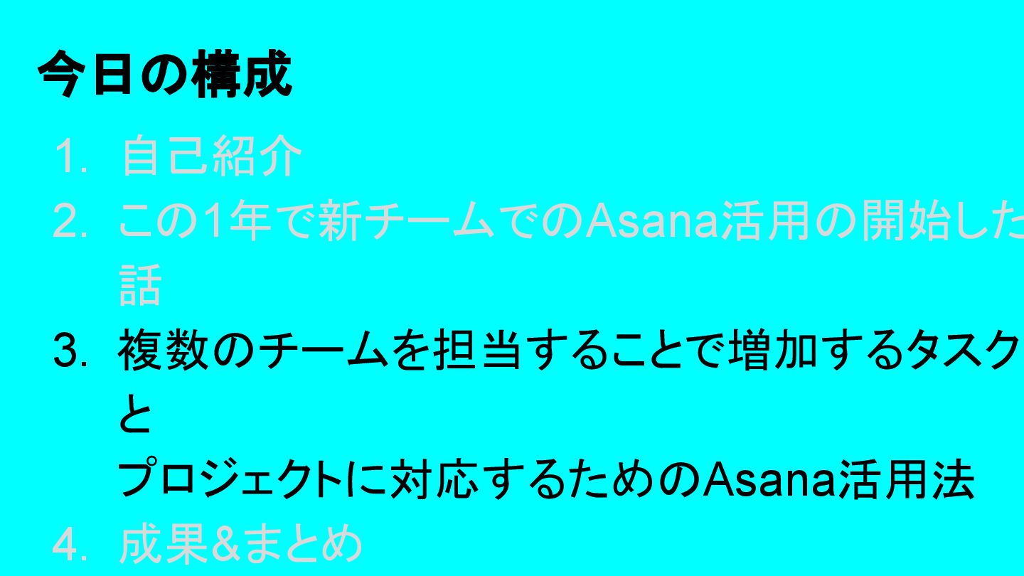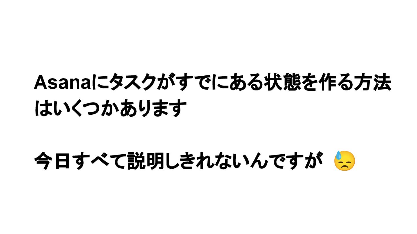 2025年05月13日(火)に開催されたイベント Asana AI Studio〜人間とAIが共創する新しい働き方 2025〜 で Asanaの導入プロセスや作業の自動化や効率化やその成果 などを紹介しました そのスライドを全公開です。 イベント当日の様子は記事になっています。 https://www.work-management.jp/blog/improved-productivity-across-multiple-teams