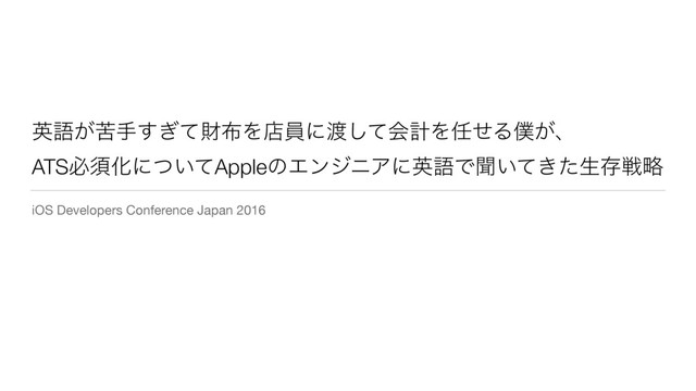ӳޠ͕ۤख͗ͯ͢ࡒΛళһʹͯ͠ձܭΛͤΔ͕ɺ ATSඞਢԽʹ͍ͭͯAppleͷΤϯδχΞʹӳޠͰฉ͍͖ͯͨੜଘઓུ iOS Developers Conference Japan 2016 ͜ͷ͙Β͍ӳޠͤͳ͍