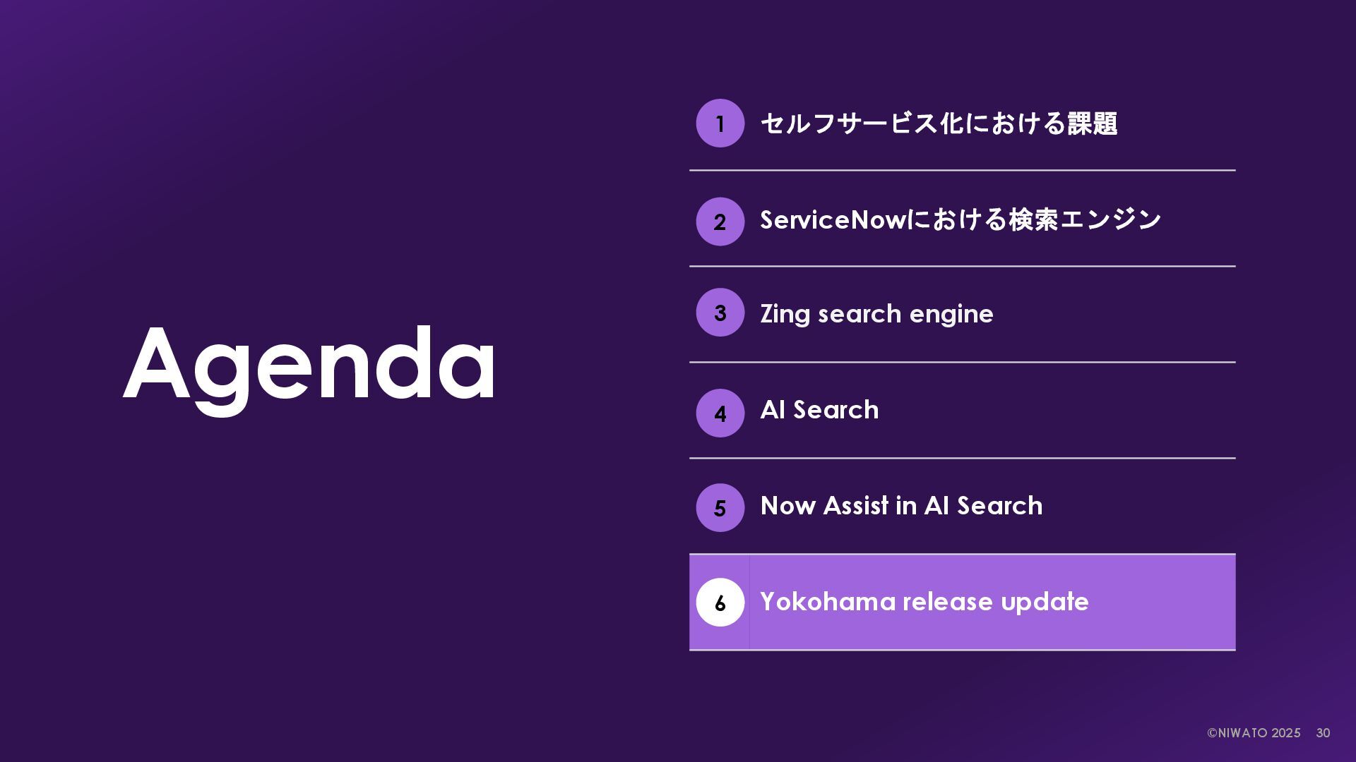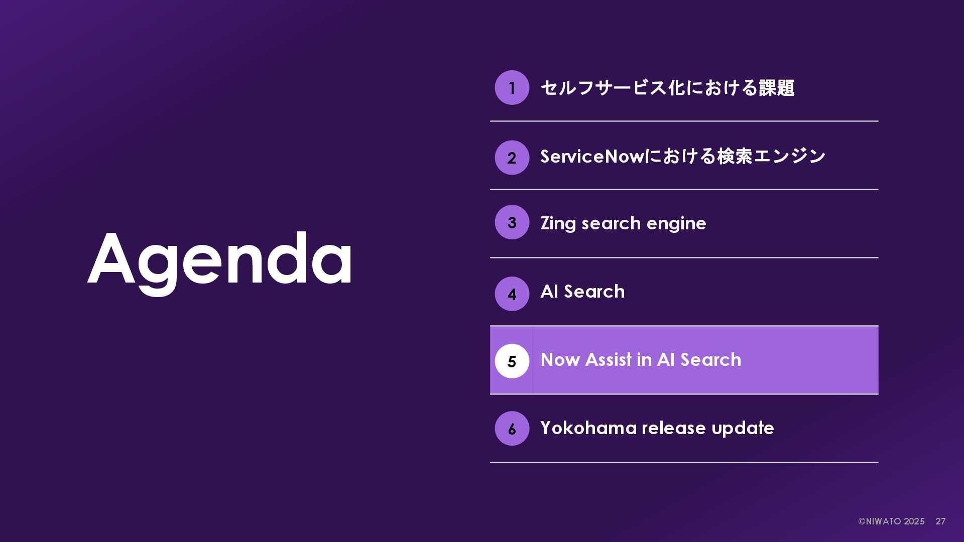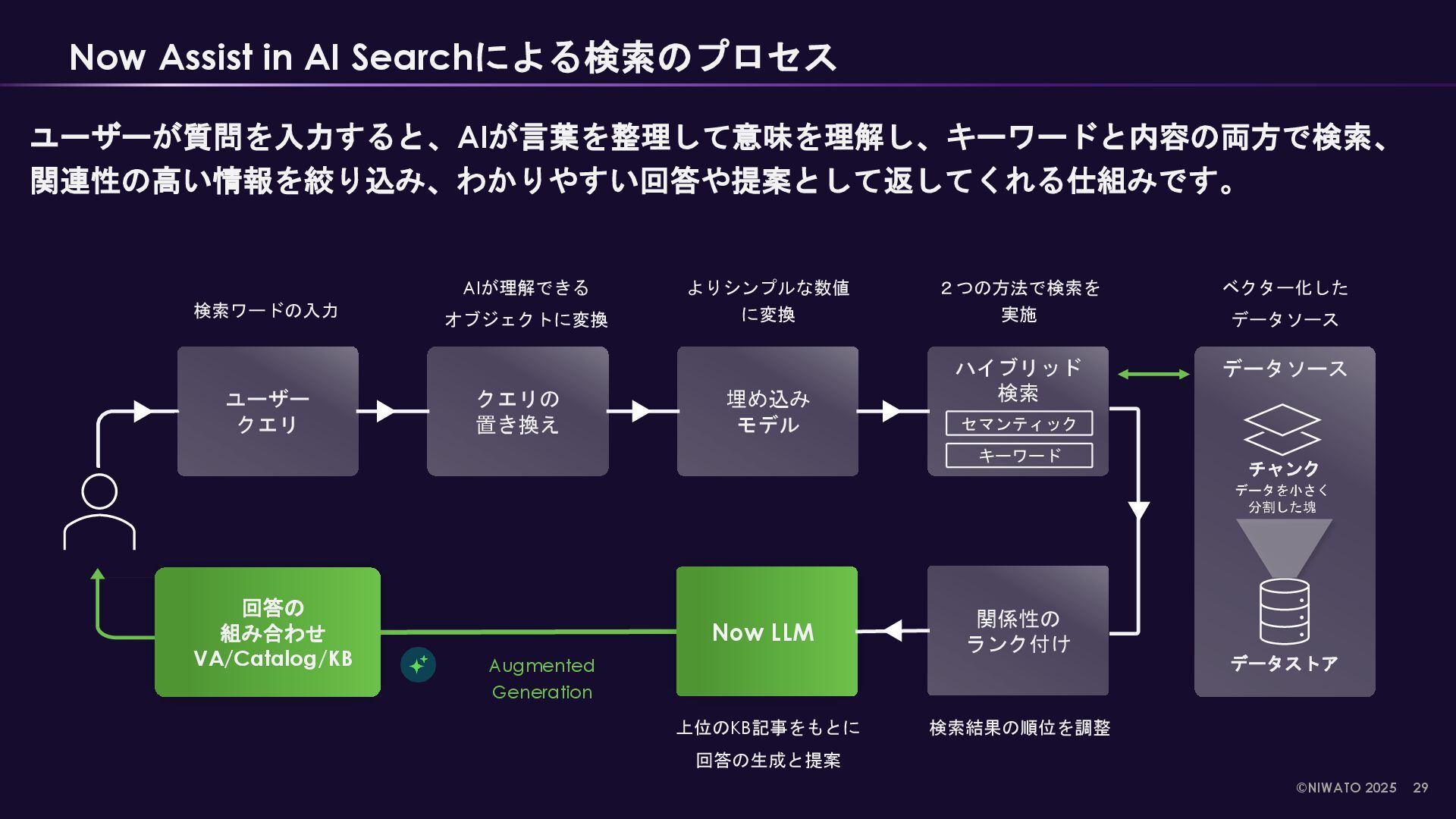 in AI Search Single character Search NLU & ML Search RAG & LLM Search Now platform内のレコードを 検索する。 ServiceNowにおけるデフォ ルトの検索エンジン。 Now platform & 外部コンテンツ を検索する。 ユーザーの行動と意図を理解して、 関連性の高い結果を提供する検索 エンジン。 より強化されたAIによる最も関 連性の高い検索結果の提供と要 約文を生成する。 AI Searchが生成AIによって強 化された検索エンジン。 検索エンジンの変化 検索エンジンの強化 ServiceNowにおける”検索エンジン”の進化 検索エンジンはZingとAI Searchの2つ、Now AssistはAI Searchをより強化する位置づけである。