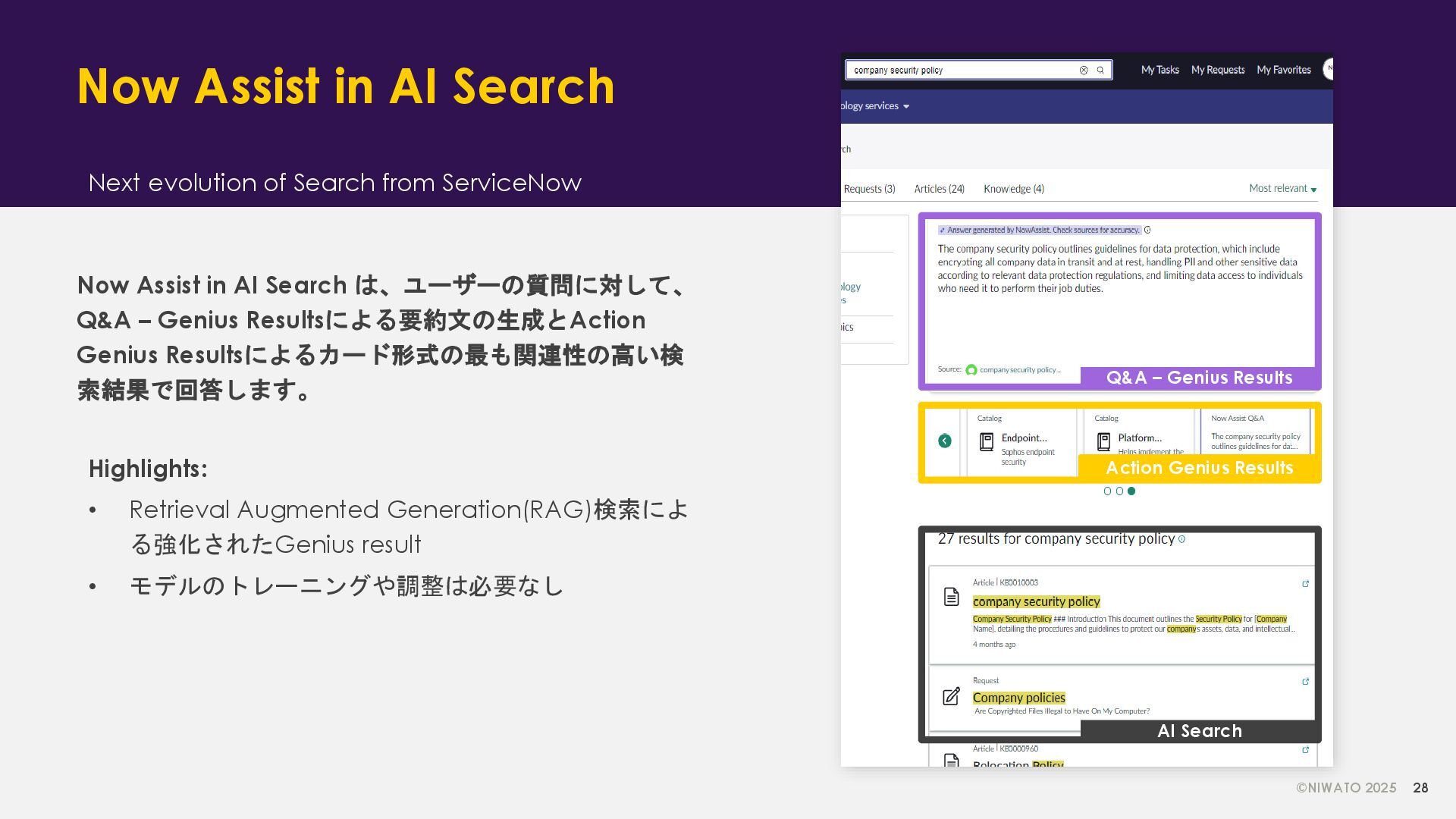 in AI Search は、ユーザーの質問に対して、 Q&A – Genius Resultsによる要約文の生成とAction Genius Resultsによるカード形式の最も関連性の高い検 索結果で回答します。 Highlights: • Retrieval Augmented Generation(RAG)検索によ る強化されたGenius result • モデルのトレーニングや調整は必要なし Next evolution of Search from ServiceNow Q&A – Genius Results Action Genius Results AI Search