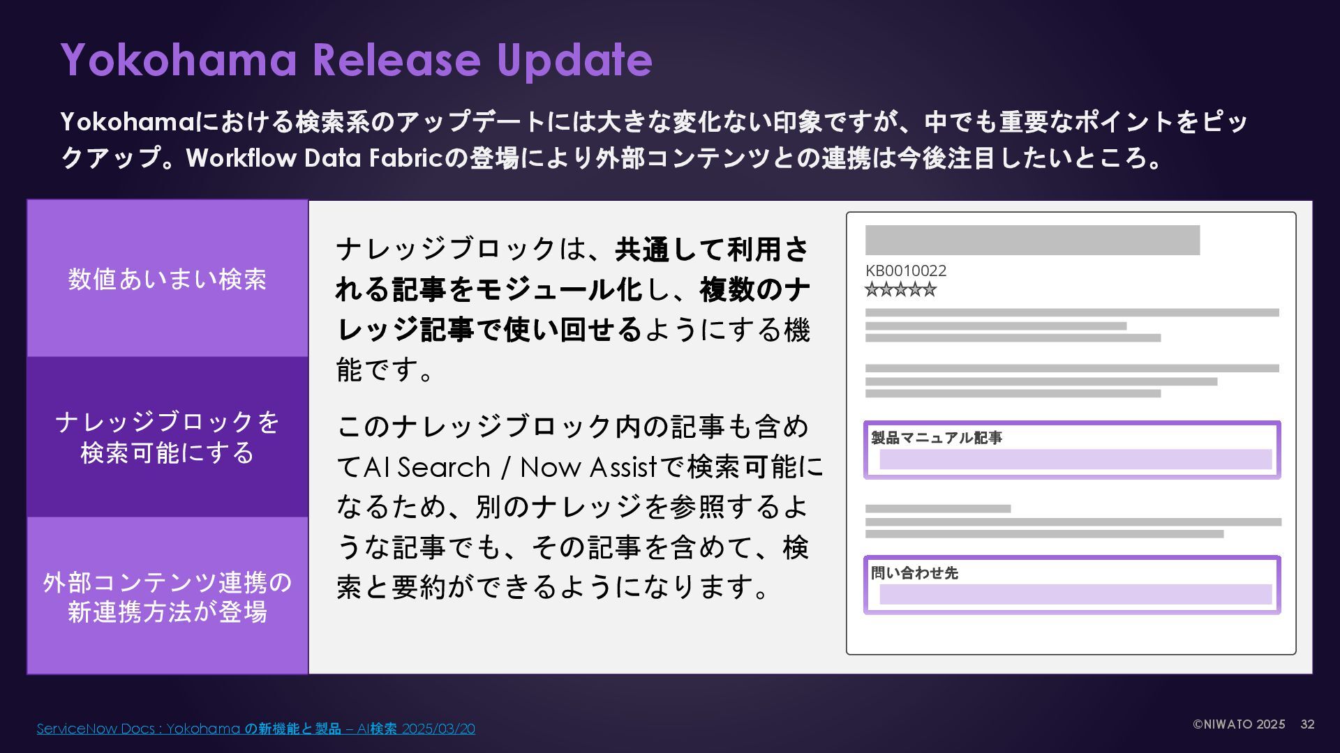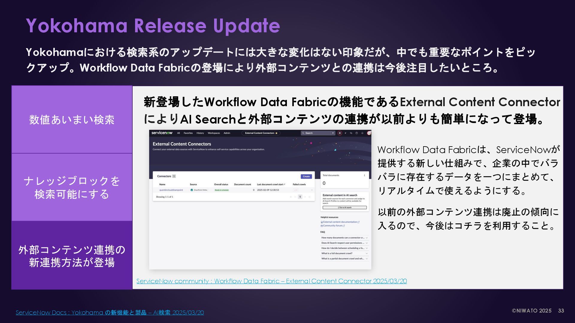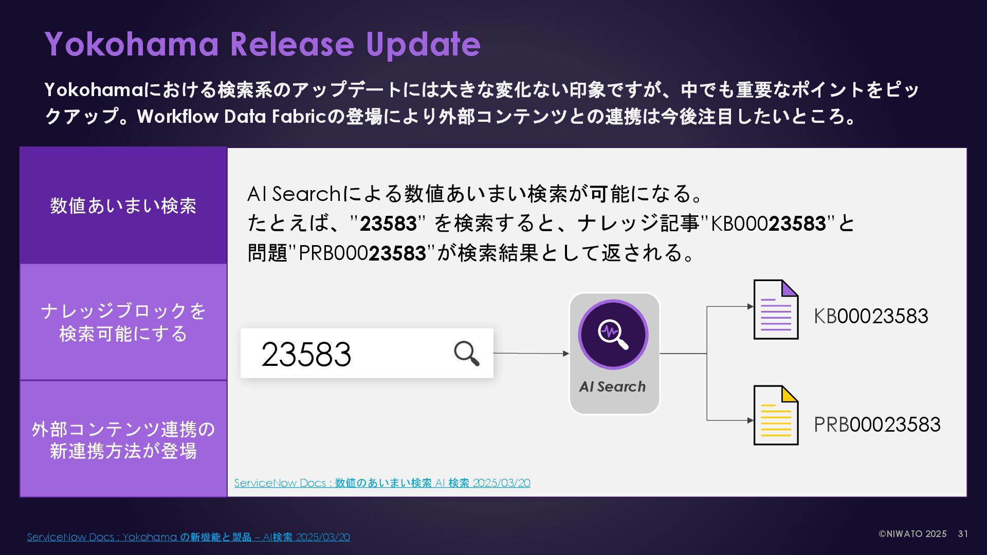 AI Search index Now Platform Table ナレッジ記事, カタログ, タスク etc Global search Service Portal Now mobile Virtual Agent Workspace search Machine Learning NLU & NLP Analytics External contents