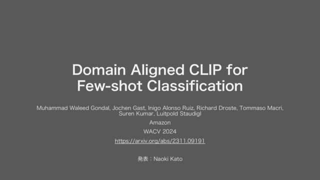 大規模事前学習モデルの CLIP を少数の学習画像から成る下流の分類タスクへ適応させる手法である Domain Aligned CLIP の解説資料です。本手法では画像特徴のモーダル内アラインメントおよび 画像/テキスト特徴のモーダル間アランメントを取るよう少量のパラメータを学習することで、既存手法を上回る認識性能を達成しています。