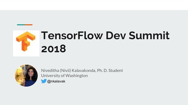 #WomenTechMakers TensorFlow for Healthcare 1. Ophthalmology - Diabetic Retinopathy a. Automated Retinal Disease Assessment (Talk from 2017 by Dr. Lily Peng: https://goo.gl/XAYLGf) b. Predict things doctors can’t - Age, Gender, Haemoglobin level and other factors (Link: https://goo.gl/XAvz9M) 2. Predictive tasks for healthcare a. Predict health given patient’s electronic medical record data b. Most likely length of stay, diagnosis, tests,etc., c. Link: https://arxiv.org/abs/1801.07860 (At-risk in next 24 hours) Weighted Kappa Opthamologists 0.80-0.84 Algorithm 0.84 Retinal Specialists 0.82-0.91