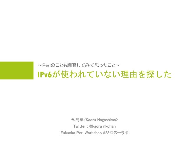 IPv6が使われていない理由を探した 永島薫<Kaoru Nagashima> Twitter : @kaoru_nkchan Fukuoka Perl Workshop #28@ヌーラボ