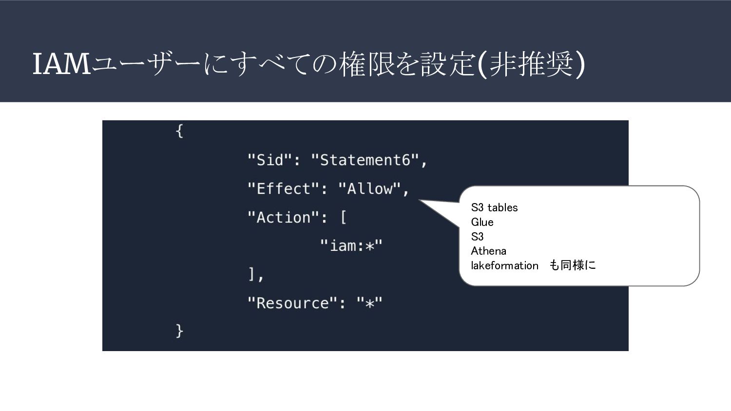 IAMユーザーにすべての権限を設定(非推奨) AWSLakeFormationDataAdmin glue:PassConnection lakeformation:RegisterResource も...? S3 tables Glue S3 Athena