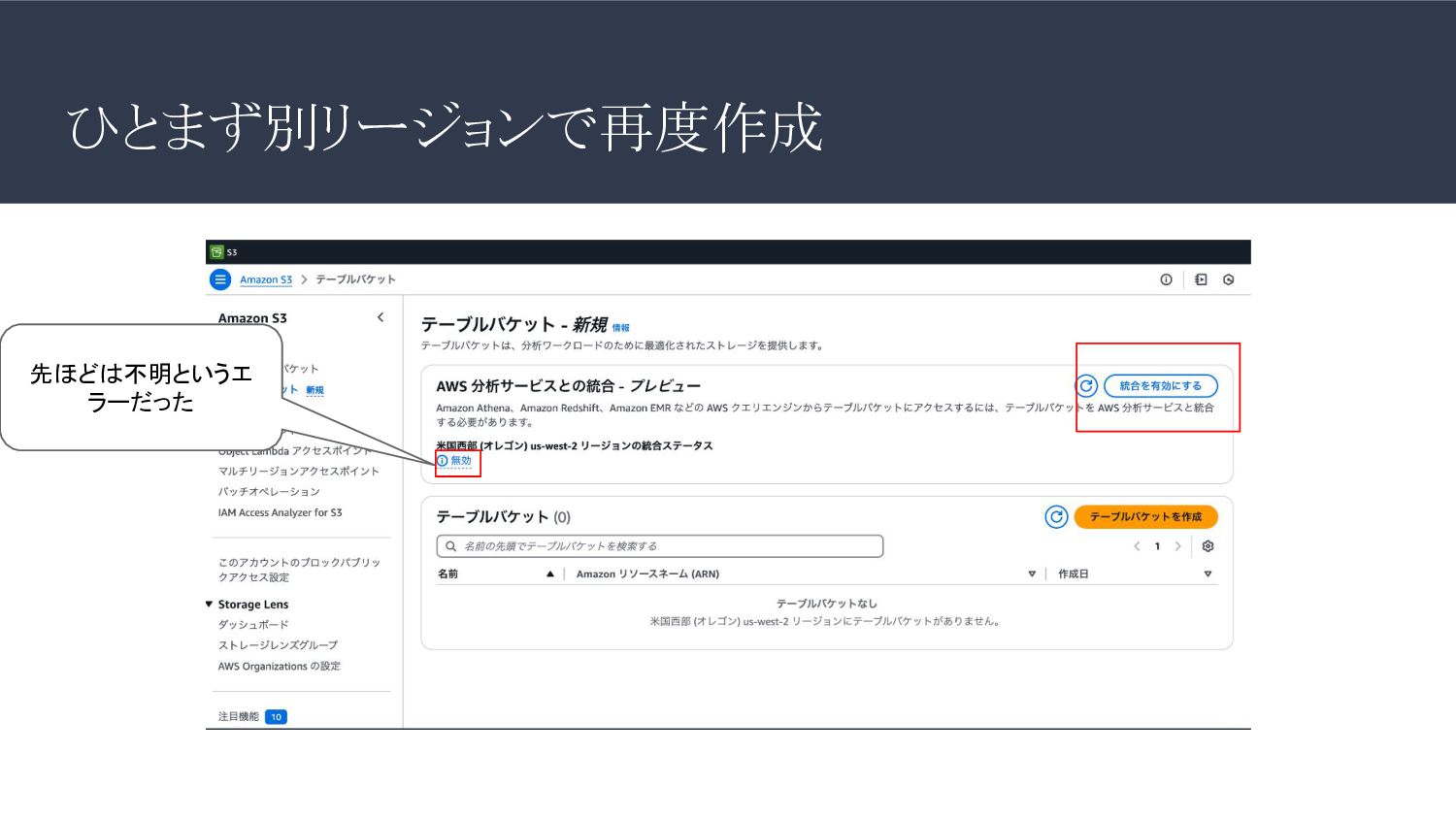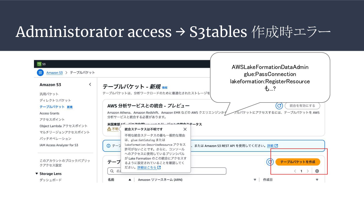 Administorator access → S3tables 作成時エラー AWSLakeFormationDataAdmin glue:PassConnection lakeformation:RegisterResource も...?