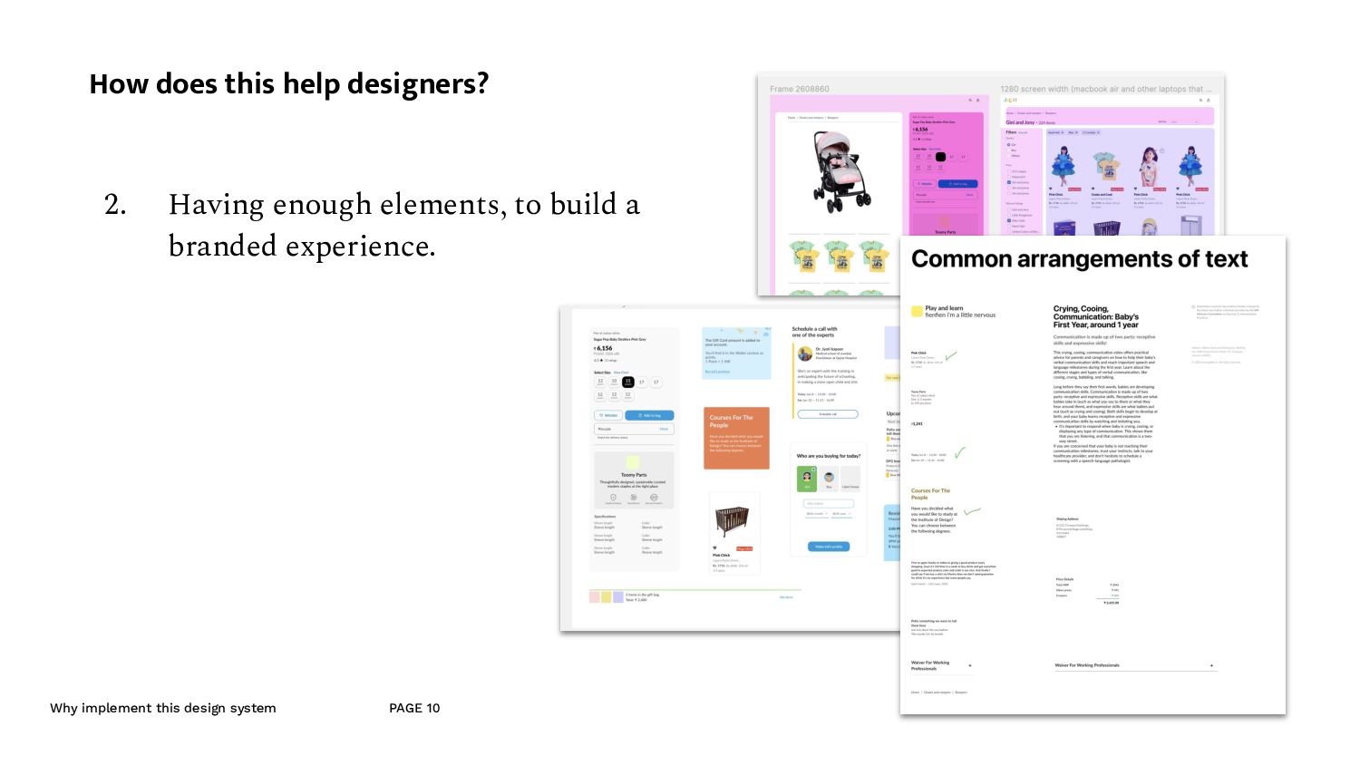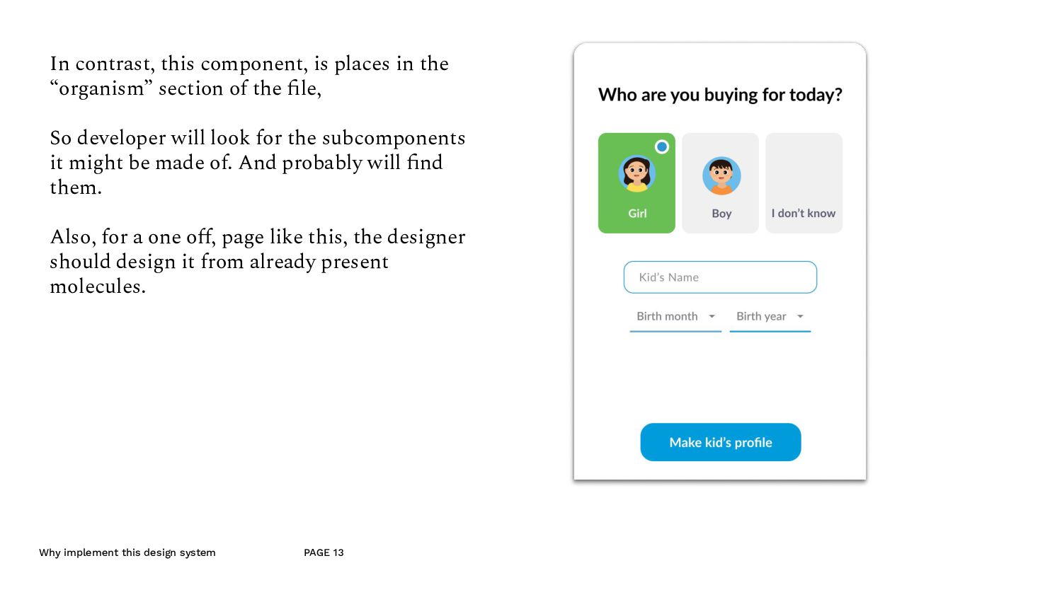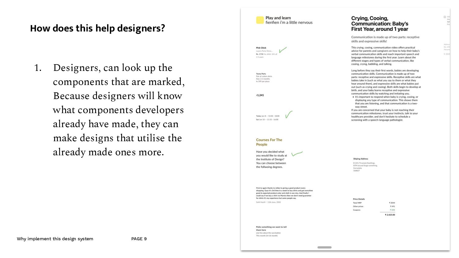an example A component made for the listing page. - Since this is quite an important component of the website, we don’t mind if a lot of developer time goes into this. - So the designer can put this into the molecule section of the design system, — i.e. it’s ok, if it’s not made out of reusable components. - And because this is in the molecule section, the developer, looks at this and understand that they’ll have to make this out of the atomic elements. (like the typography and and image etc.)