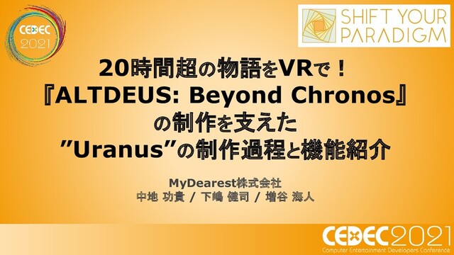 20時間超の物語をVRで!『ALTDEUS: Beyond Chronos』の制作を支えた”Uranus”の制作過程と機能紹介 https://cedec.cesa.or.jp/2021/session/detail/s6058637b527da