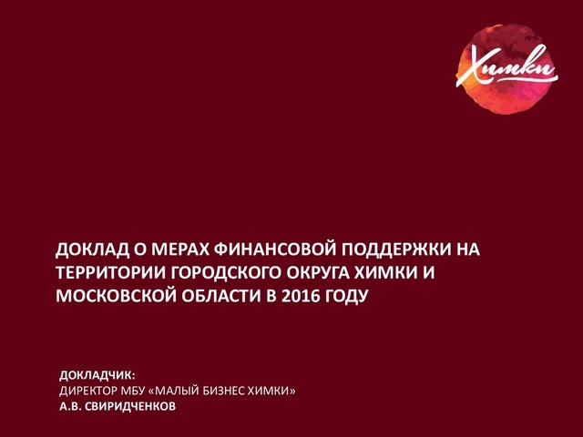ХИМКИ И МОСКОВСКОЙ ОБЛАСТИ В 2016 ГОДУ Свиридченков А.В. Максимальный размер субсидии субъекту социального предпринимательства, обеспечившего софинансирование расходов в размере не менее 50 % от суммы получаемой субсидии, не превышает 1 млн. рублей на одного получателя поддержки. В рамках данного мероприятия муниципальной программы субсидируются коммунальные затраты. Мероприятие программы – Компенсация затрат по коммунальным платежам предприятий занятых в сфере услуг.