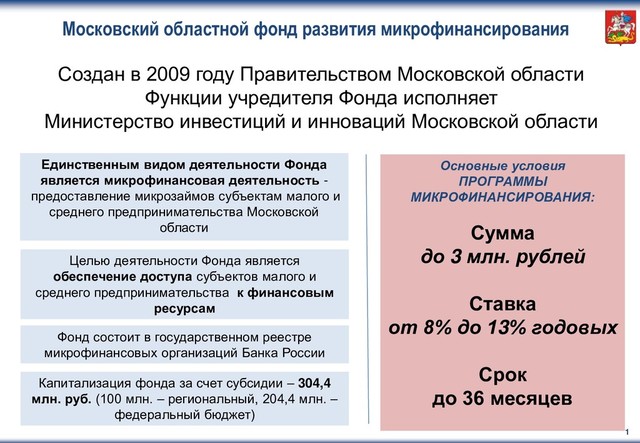 Московской области Функции учредителя Фонда исполняет Министерство инвестиций и инноваций Московской области Основные условия ПРОГРАММЫ МИКРОФИНАНСИРОВАНИЯ: Сумма до 3 млн. рублей Ставка от 8% до 13% годовых Срок до 36 месяцев 1 Единственным видом деятельности Фонда является микрофинансовая деятельность - предоставление микрозаймов субъектам малого и среднего предпринимательства Московской области Целью деятельности Фонда является обеспечение доступа субъектов малого и среднего предпринимательства к финансовым ресурсам Капитализация фонда за счет субсидии – 304,4 млн. руб. (100 млн. – региональный, 204,4 млн. – федеральный бюджет) Фонд состоит в государственном реестре микрофинансовых организаций Банка России