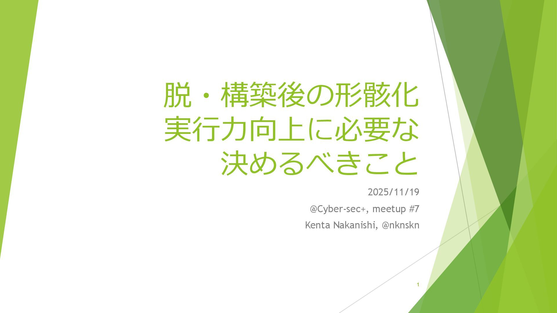 脱・構築後の形骸化 実⾏⼒向上に必要な 決めるべきこと 2025/11/19 @Cyber-sec+, meetup #7 Kenta Nakanishi, @nknskn