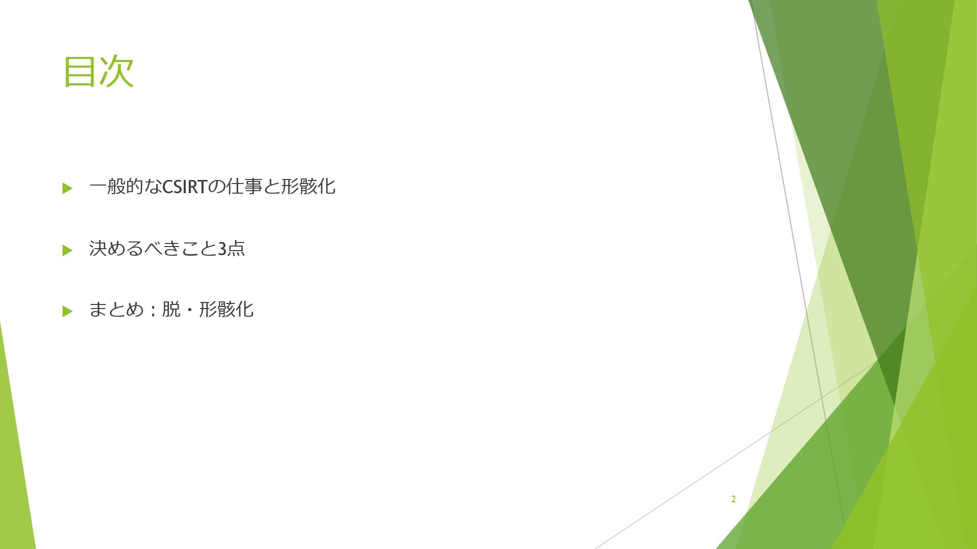 ⽬次 u ⼀般的なCSIRTの仕事と形骸化 u 決めるべきこと3点 u まとめ︓脱・形骸化 2
