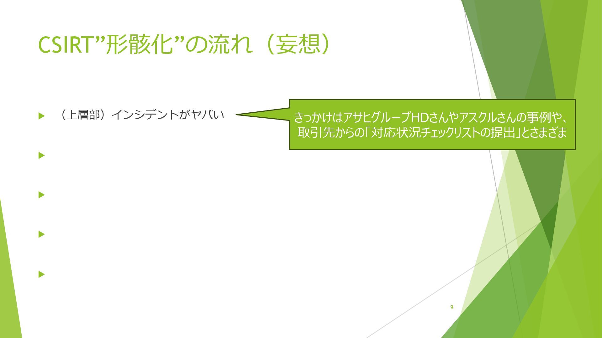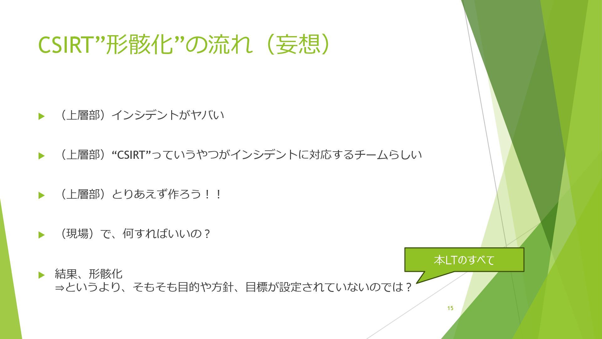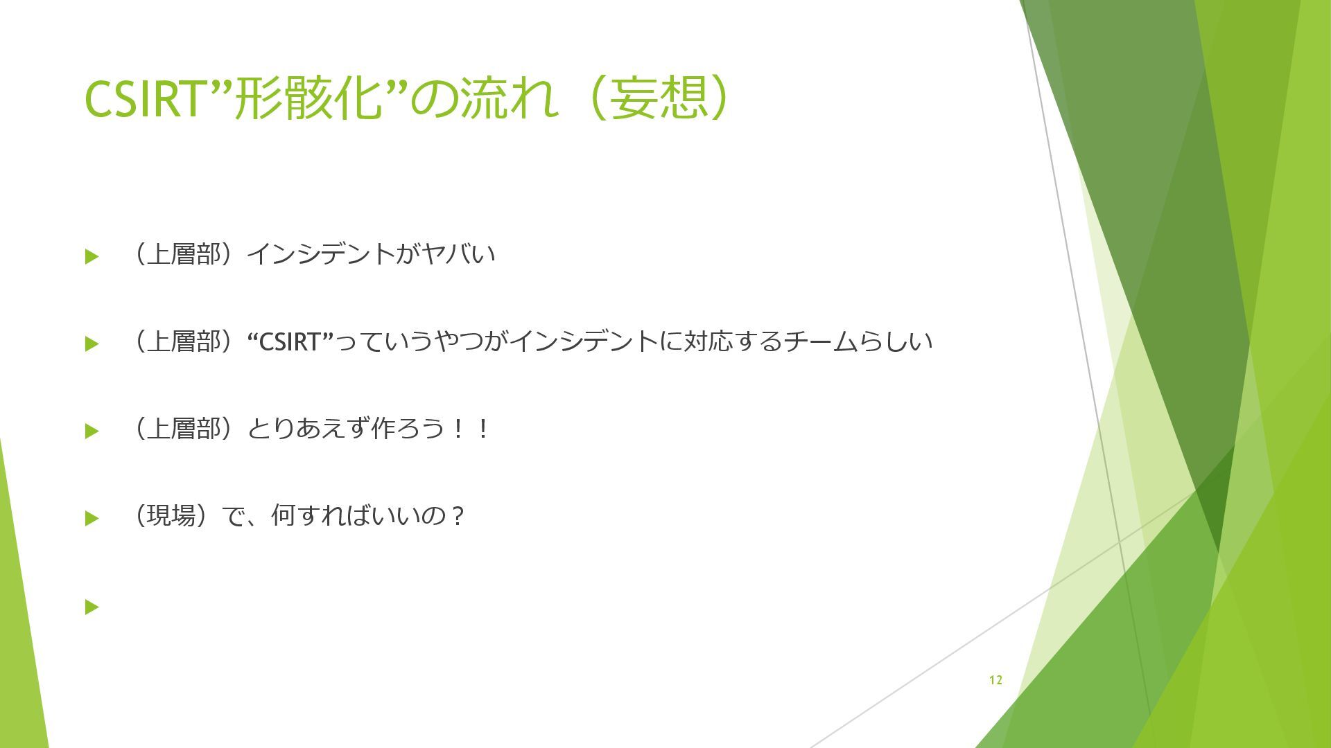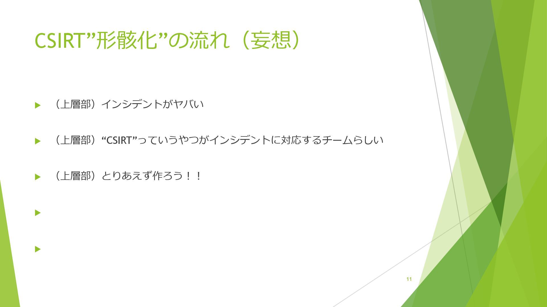 CSIRT”形骸化”の流れ(妄想) u (上層部)インシデントがヤバい u (上層部)“CSIRT”っていうやつがインシデントに対応するチームらしい u (上層部)とりあえず作ろう︕︕ u (現場)で、何すればいいの︖ u