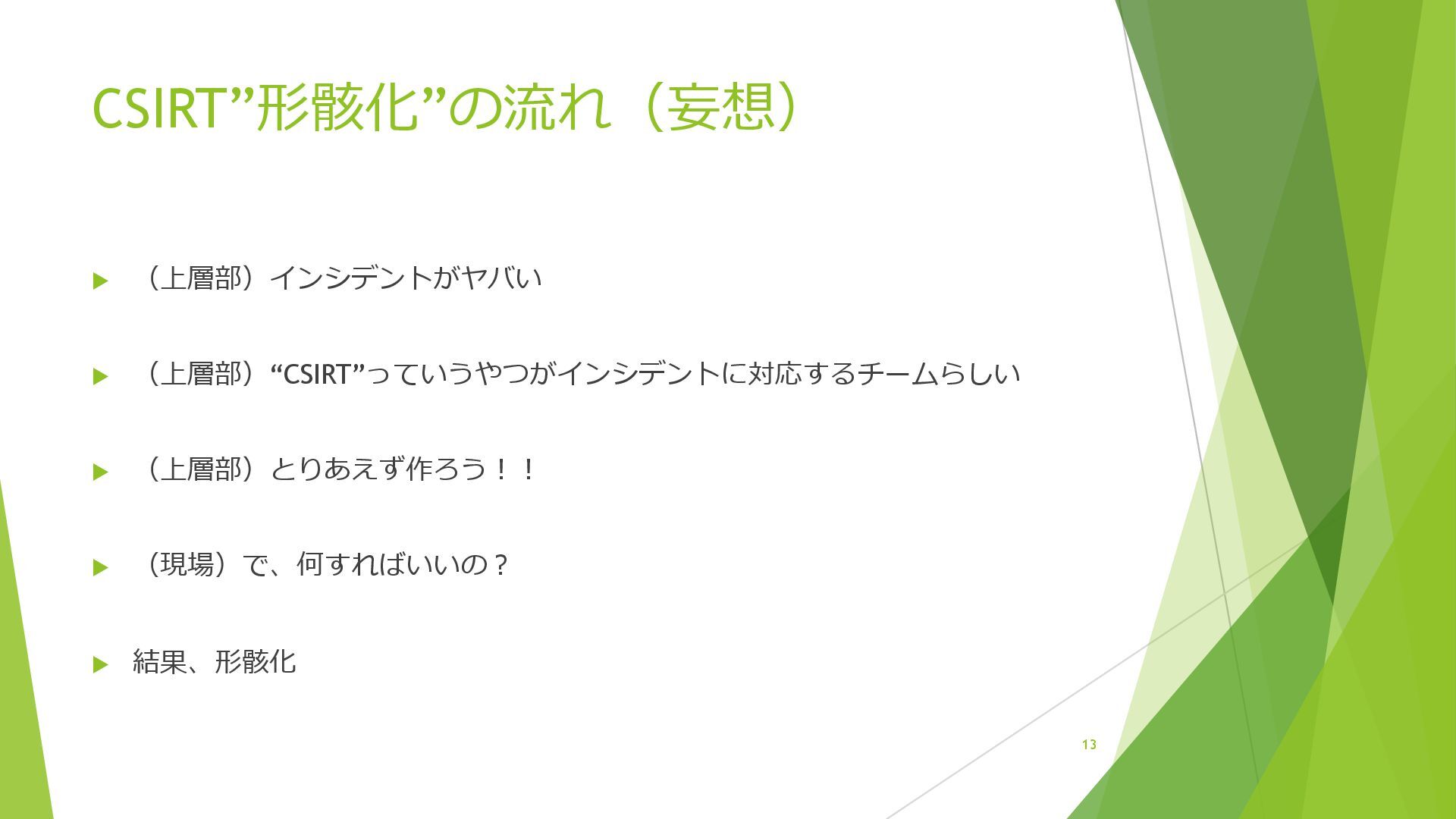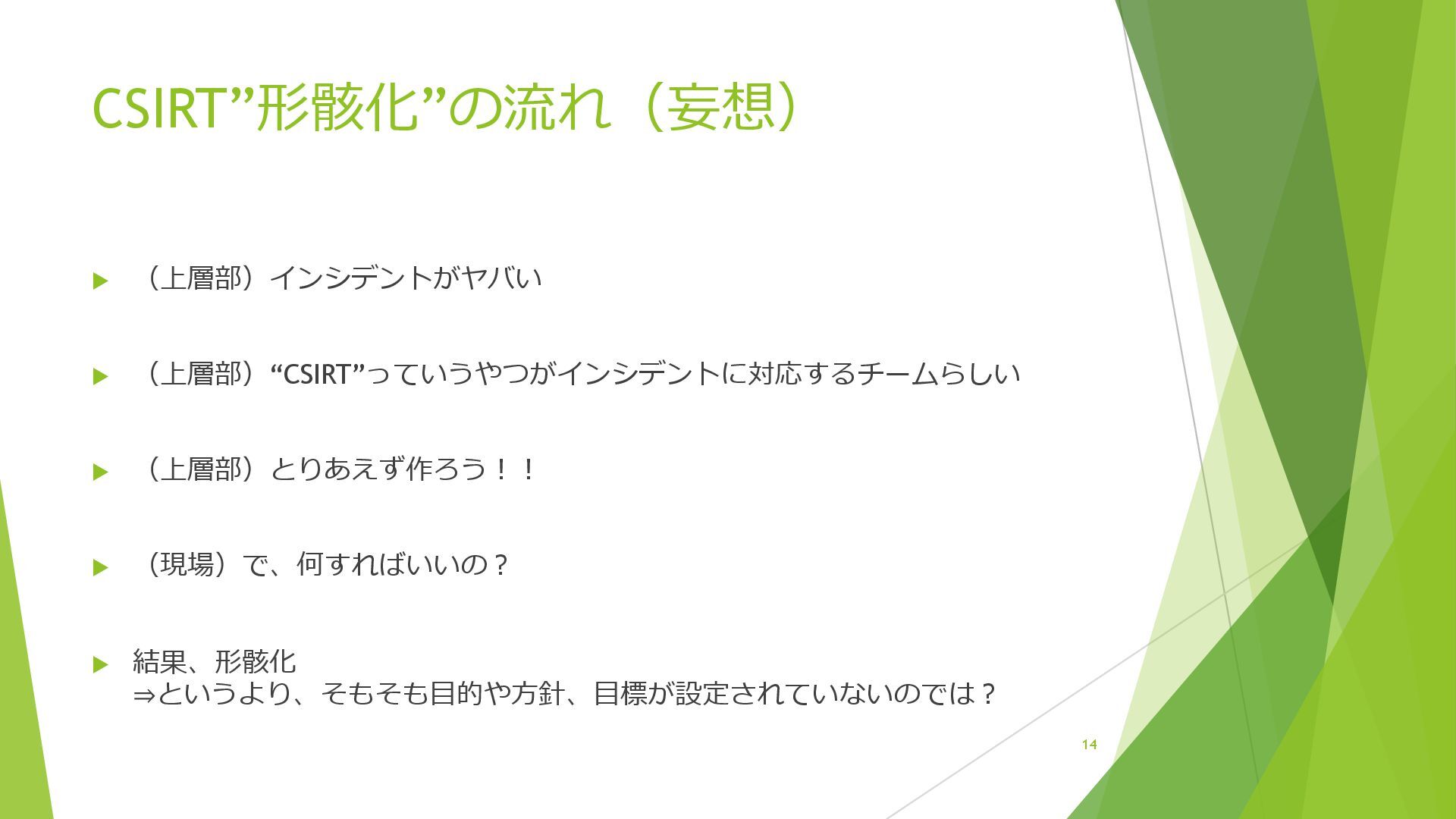 CSIRT”形骸化”の流れ(妄想) u (上層部)インシデントがヤバい u (上層部)“CSIRT”っていうやつがインシデントを対処するチームらしい u (上層部)とりあえず作ろう︕︕ u (現場)で、何すればいいの︖ u