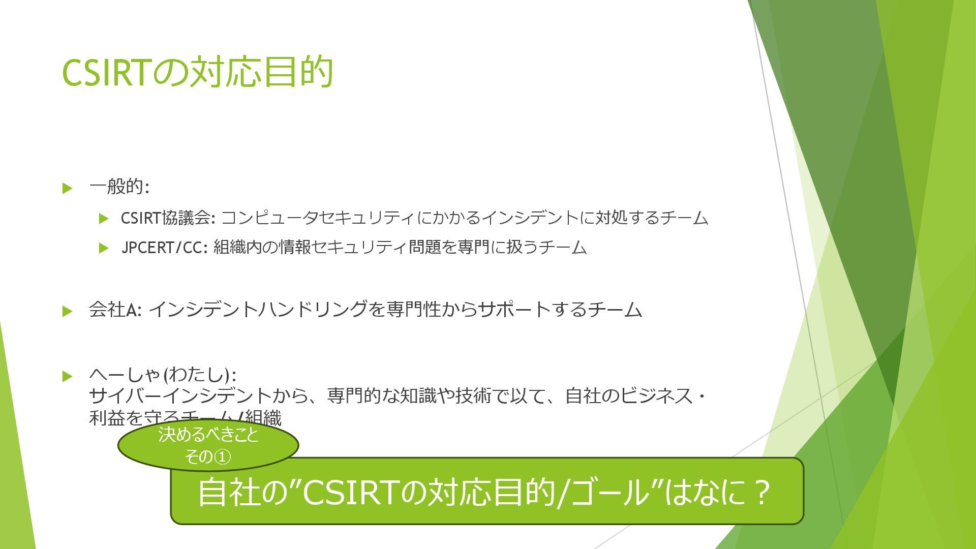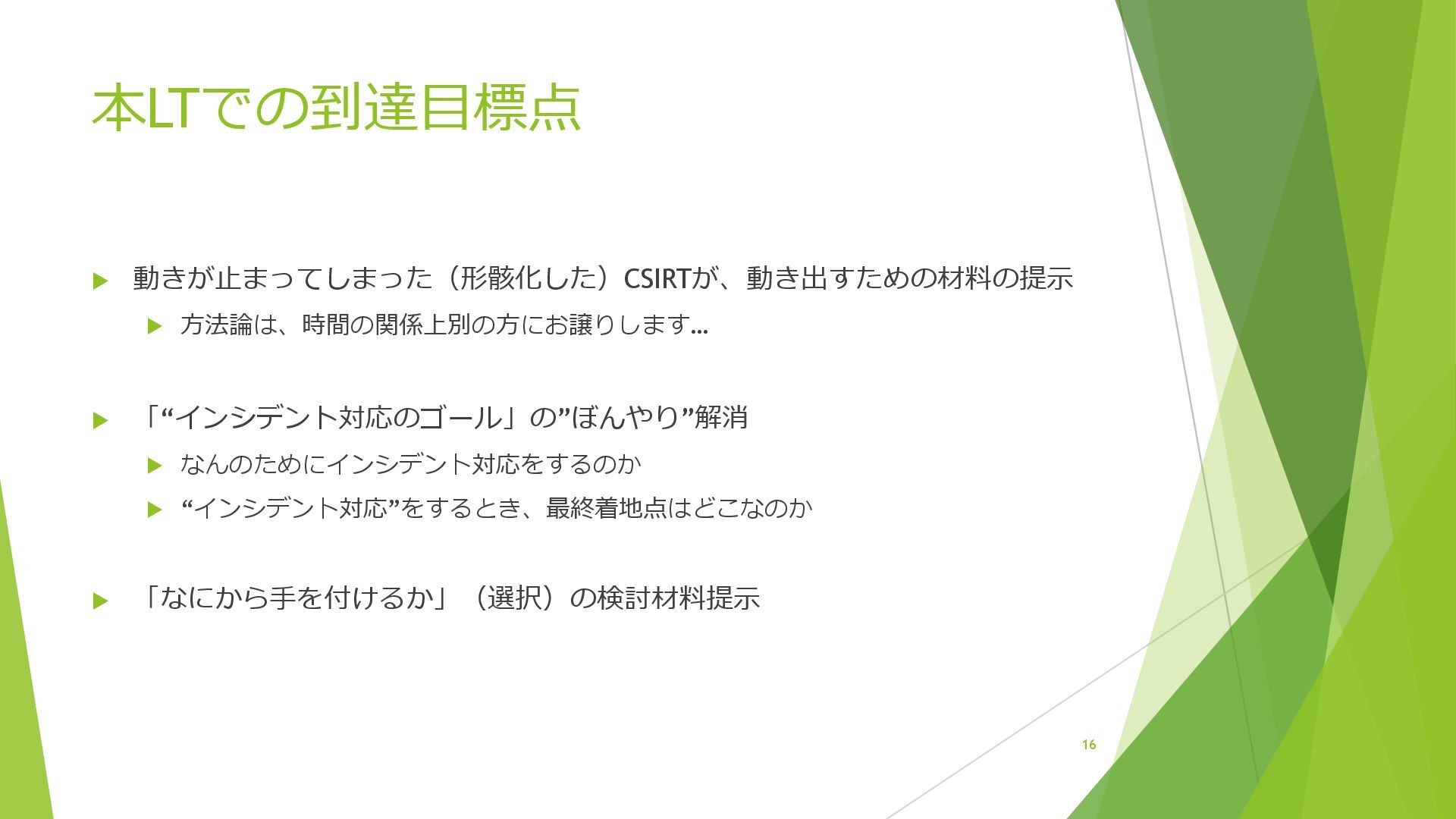 本LTでの到達⽬標点 u 動きが⽌まってしまった(形骸化した)CSIRTが、動き出すための材料の提⽰ u ⽅法論は、時間の関係上別の⽅にお譲りします… u 「“インシデント対応のゴール」の”ぼんやり”解消 u なんのためにインシデント対応をするのか u