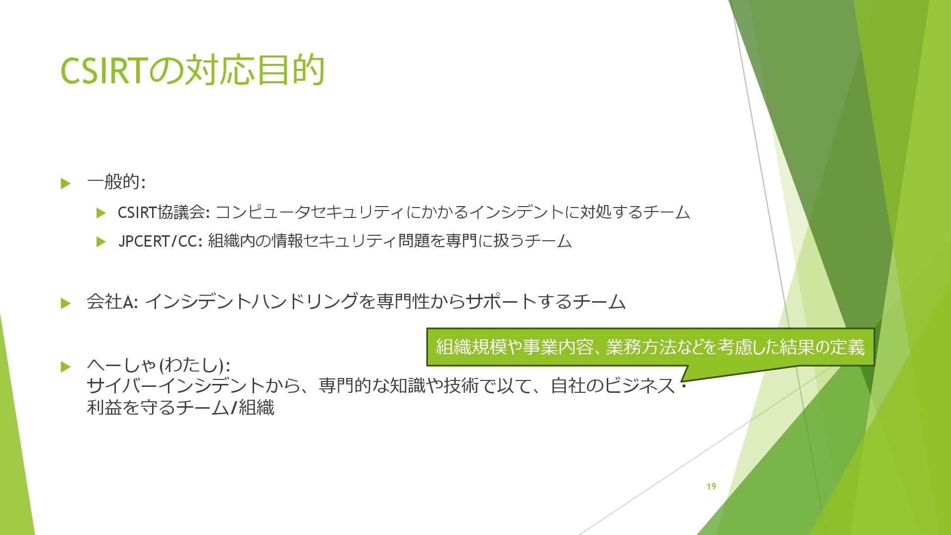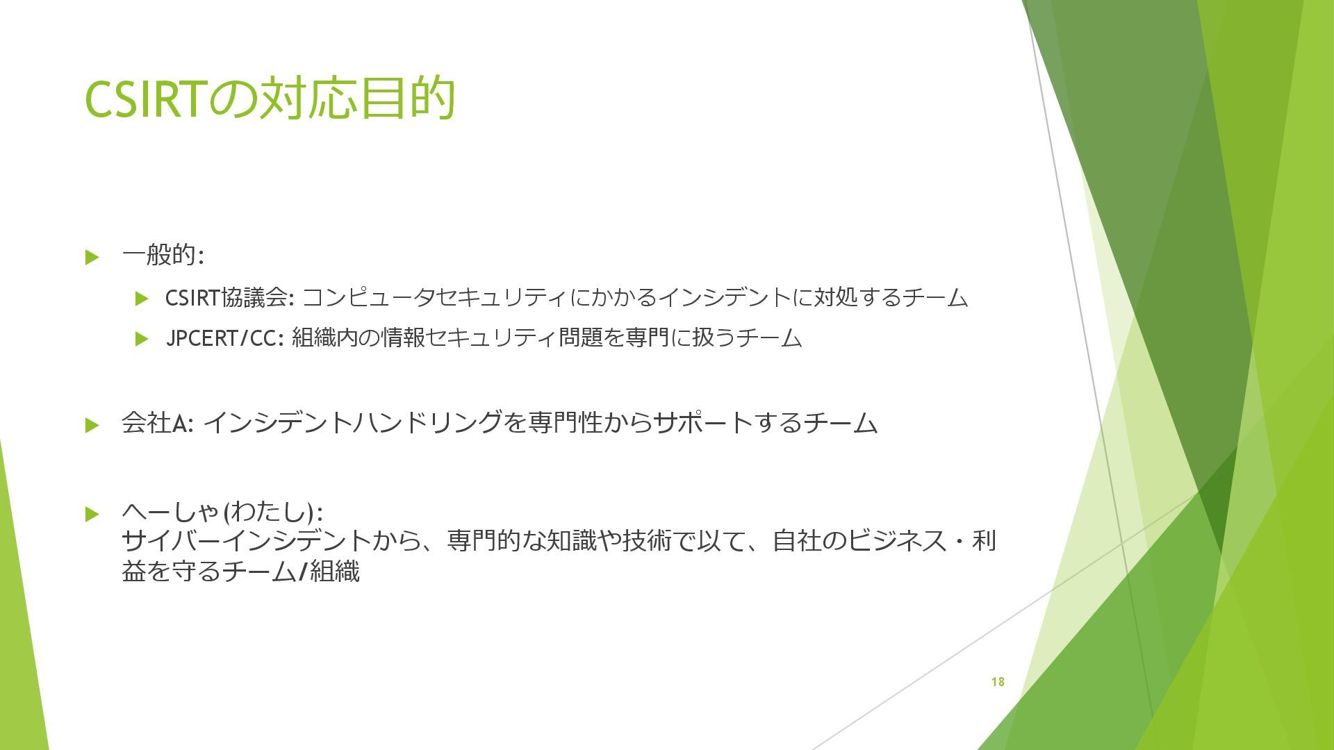 会社A: インシデントハンドリングを専⾨性からサポートするチーム u へーしゃ(わたし): サイバーインシデントから、専⾨的な知識や技術で以て、⾃社のビジネス・利 益を守るチーム/組織 18