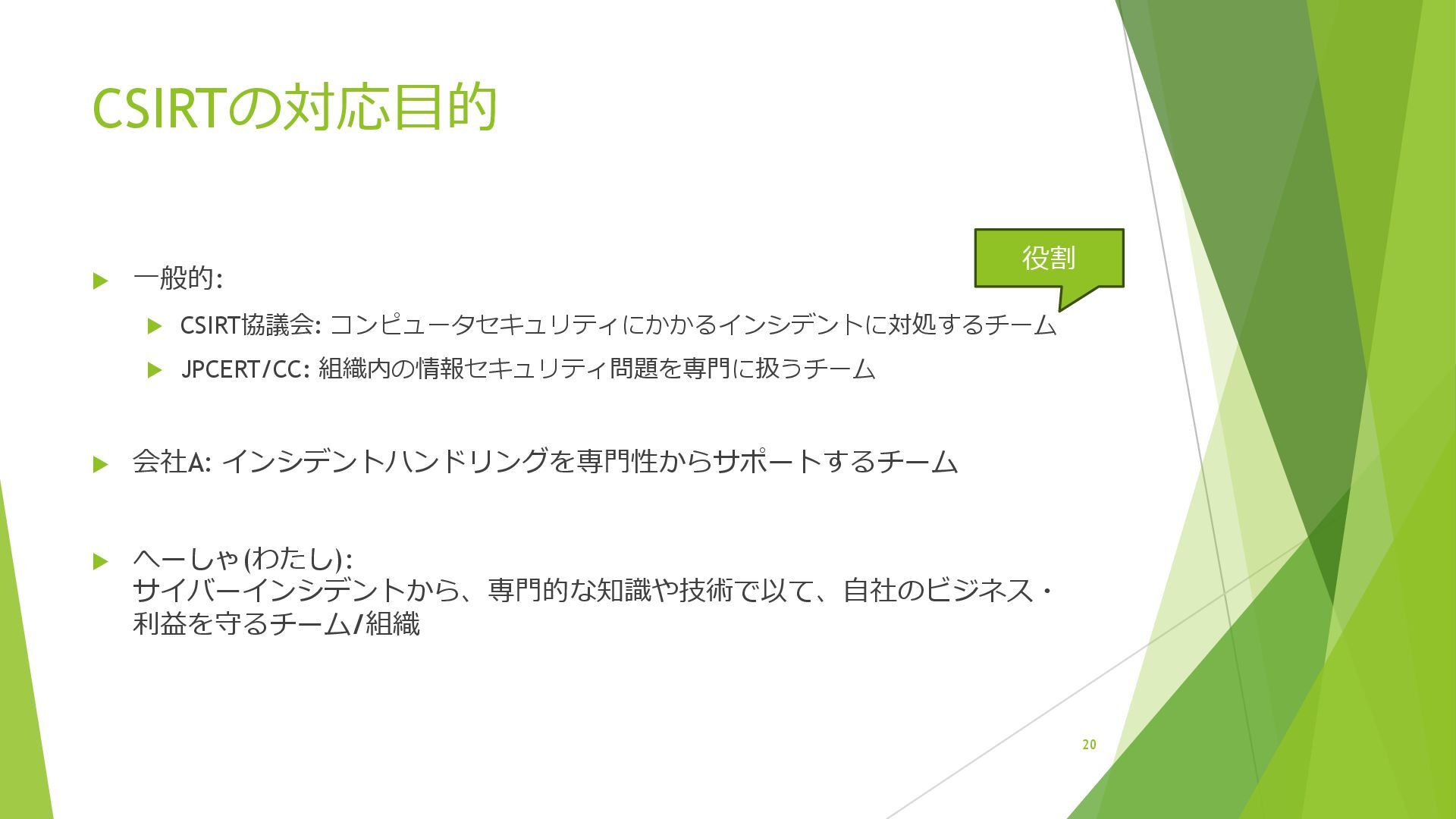 会社A: インシデントハンドリングを専⾨性からサポートするチーム u へーしゃ(わたし): サイバーインシデントから、専⾨的な知識や技術で以て、⾃社のビジネス・ 利益を守るチーム/組織 19 組織規模や事業内容、業務⽅法などを考慮した結果の定義
