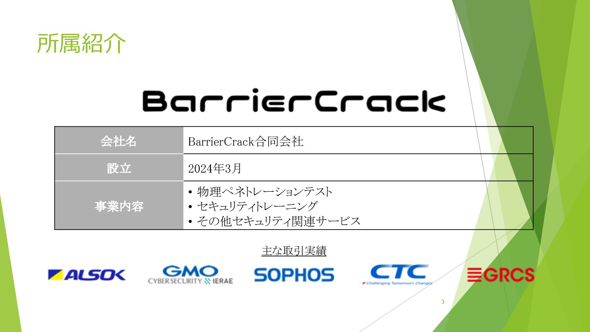 所属紹介 3 会社名 BarrierCrack合同会社 設立 2024年3月 事業内容 • 物理ペネトレーションテスト •