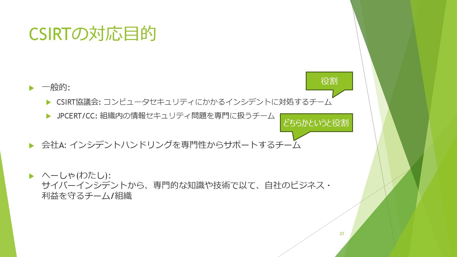 会社A: インシデントハンドリングを専⾨性からサポートするチーム u へーしゃ(わたし): サイバーインシデントから、専⾨的な知識や技術で以て、⾃社のビジネス・ 利益を守るチーム/組織 20 役割