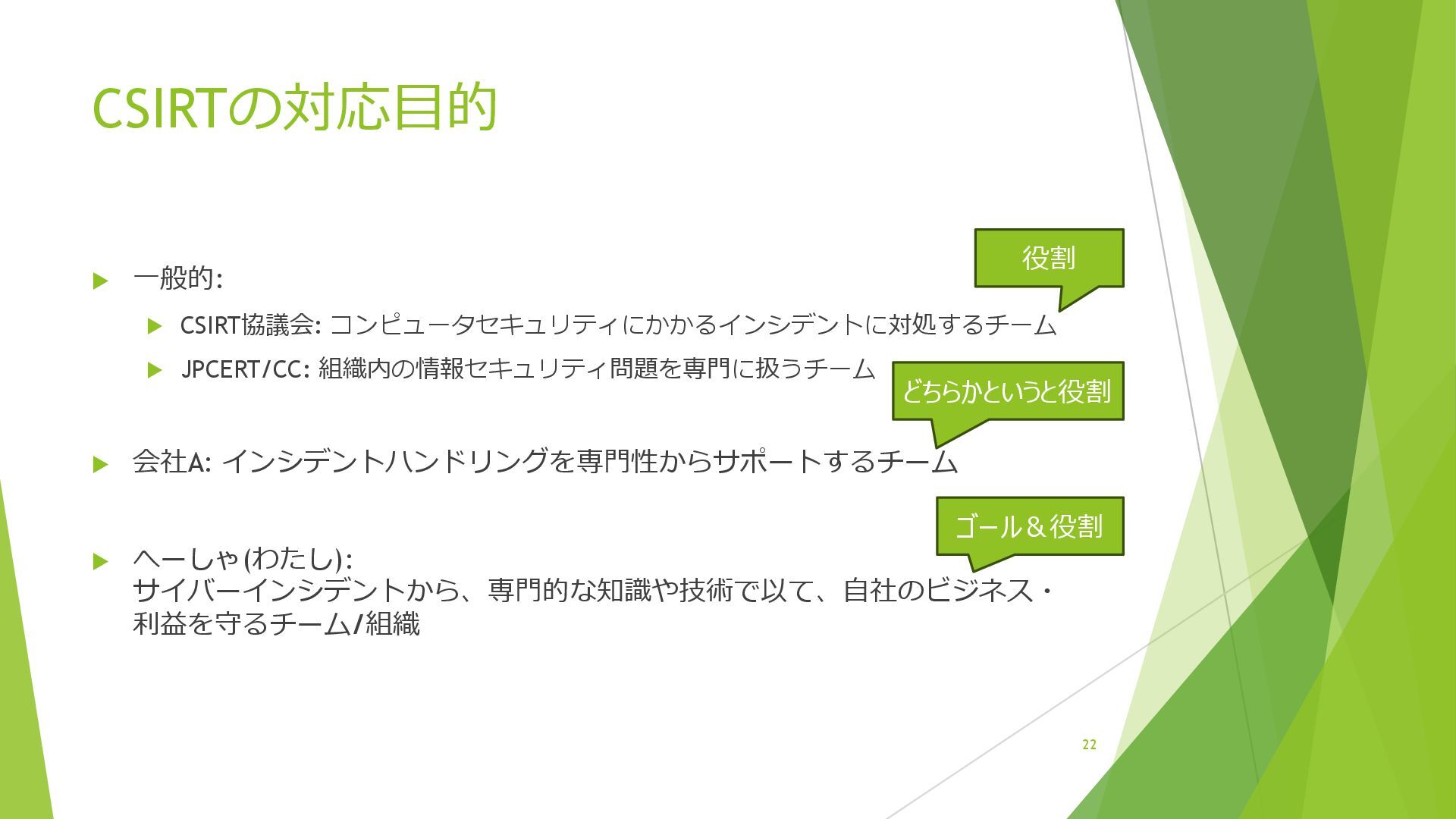 会社A: インシデントハンドリングを専⾨性からサポートするチーム u へーしゃ(わたし): サイバーインシデントから、専⾨的な知識や技術で以て、⾃社のビジネス・ 利益を守るチーム/組織 21 どちらかというと役割 役割