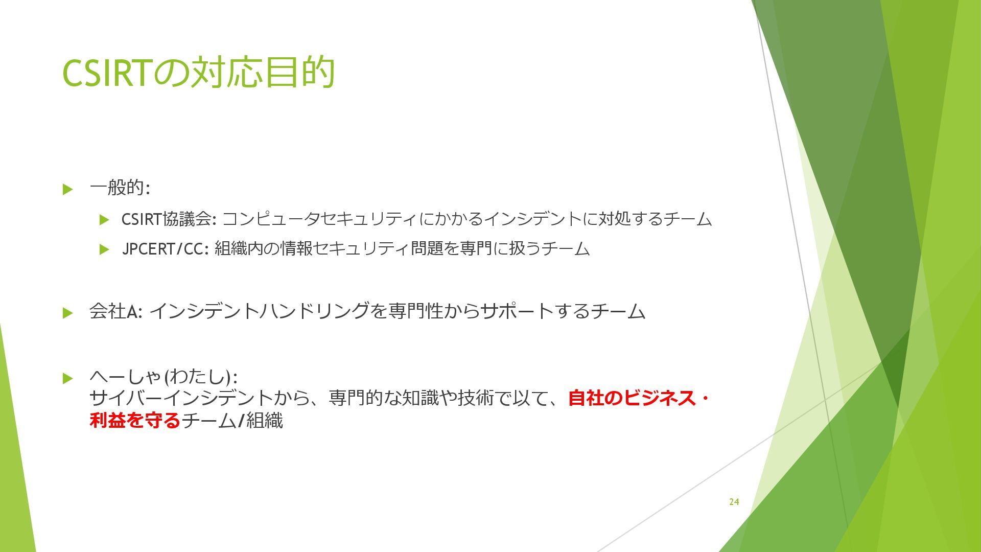 会社A: インシデントハンドリングを専⾨性からサポートするチーム u へーしゃ(わたし): サイバーインシデントから、専⾨的な知識や技術で以て、⾃社のビジネス・ 利益を守るチーム/組織 24