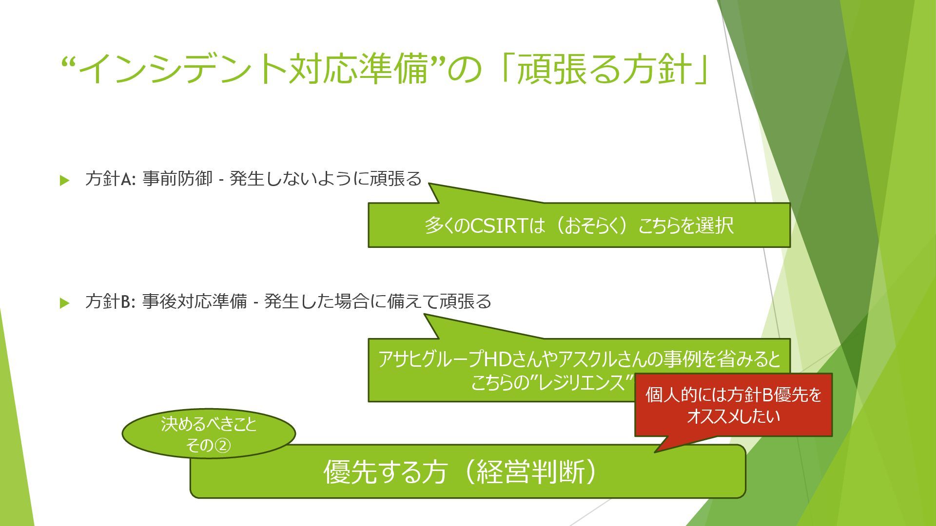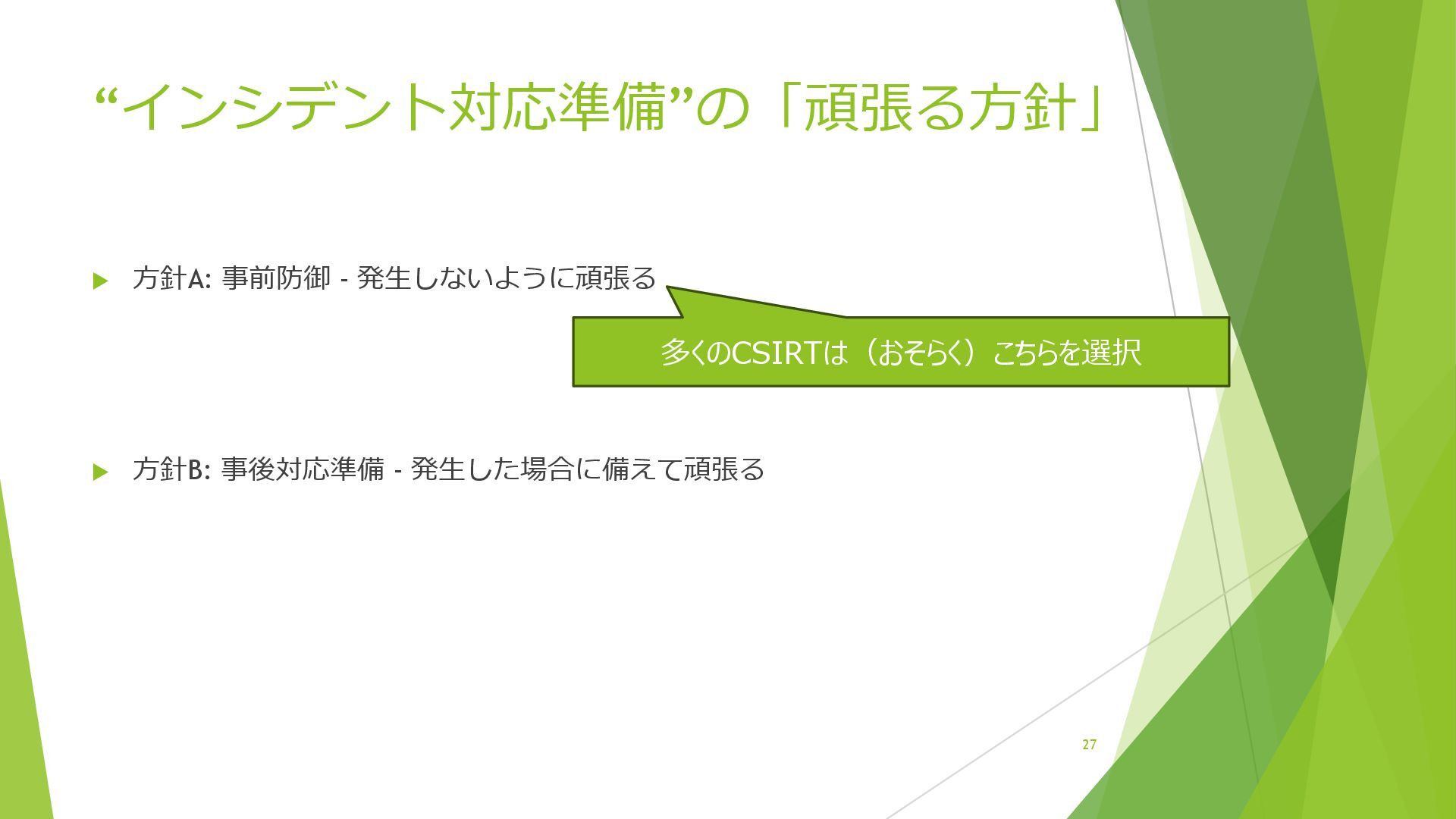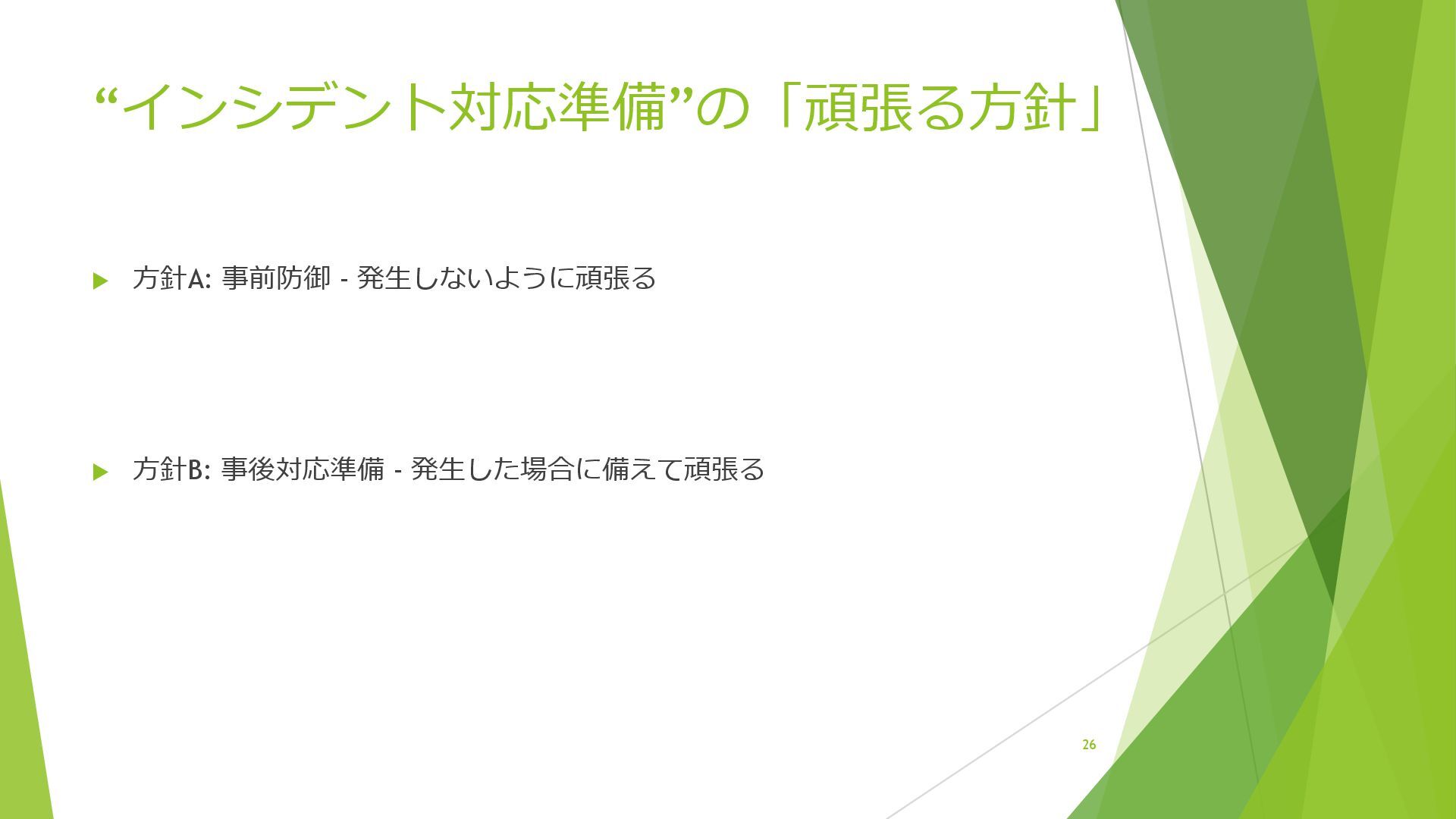“インシデント対応準備”の「頑張る⽅針」 u ⽅針A: 事前防御 - 発⽣しないように頑張る u ⽅針B: 事後対応準備 -