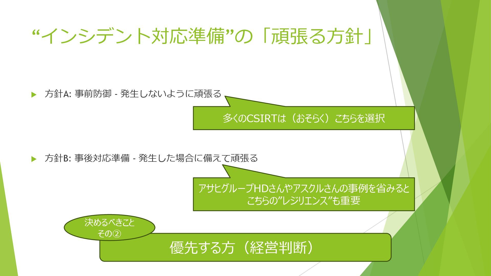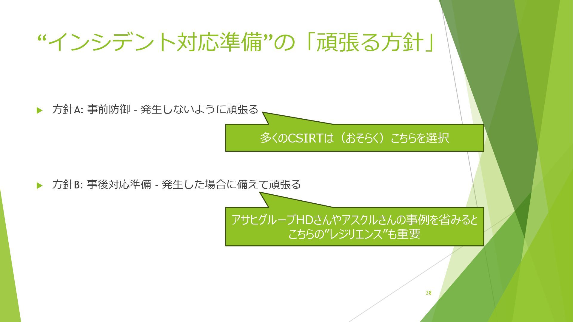 発⽣した場合に備えて頑張る 28 アサヒグループHDさんやアスクルさんの事例を省みると こちらの”レジリエンス”も重要 多くのCSIRTは(おそらく)こちらを選択