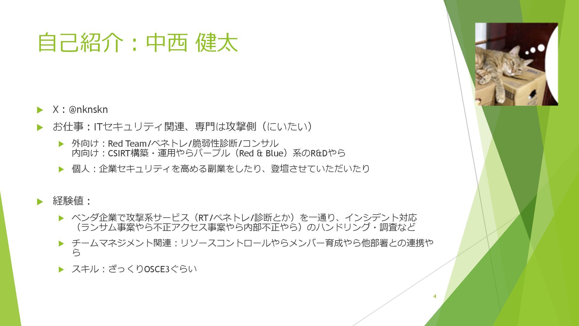 ⾃⼰紹介︓中⻄ 健太 u X︓@nknskn u お仕事︓ITセキュリティ関連、専⾨は攻撃側(にいたい) u 外向け︓Red Team/ペネトレ/脆弱性診断/コンサル 内向け︓CSIRT構築・運⽤やらパープル(Red