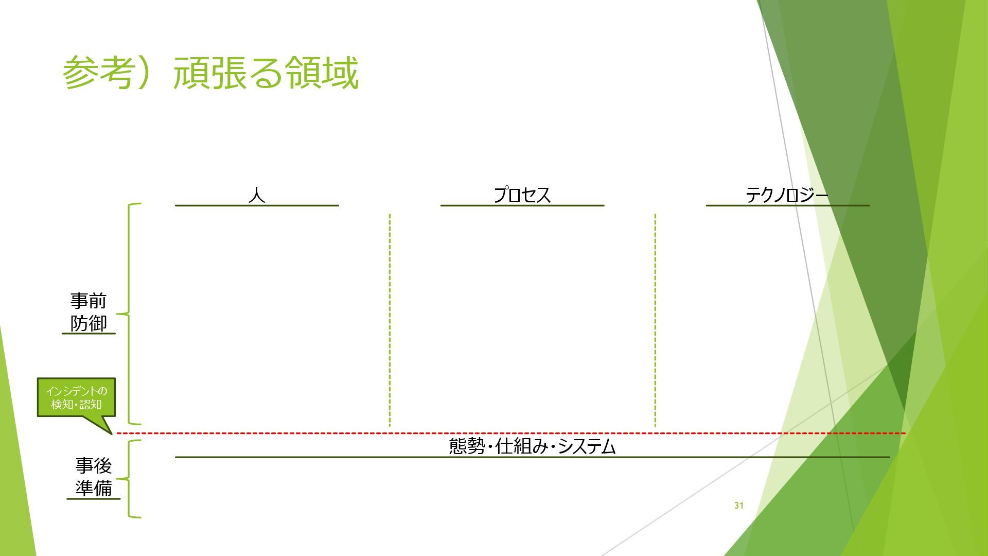 参考)頑張る領域 31 ⼈ プロセス テクノロジー 事前 防御 事後 準備 態勢・仕組み・システム