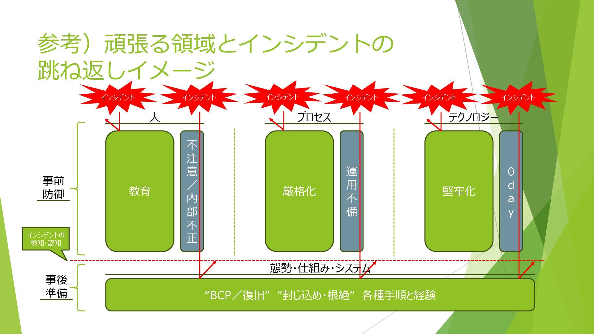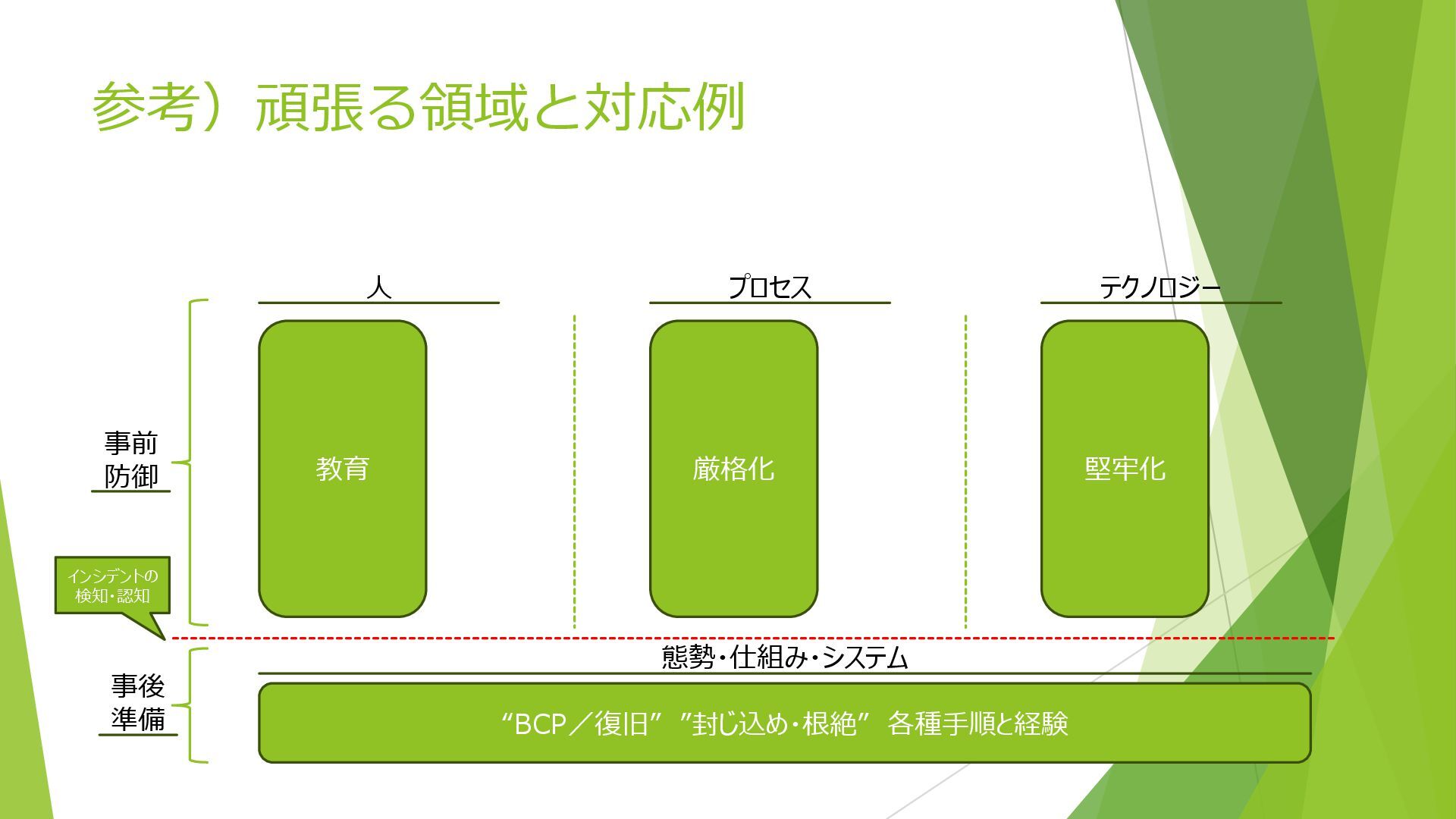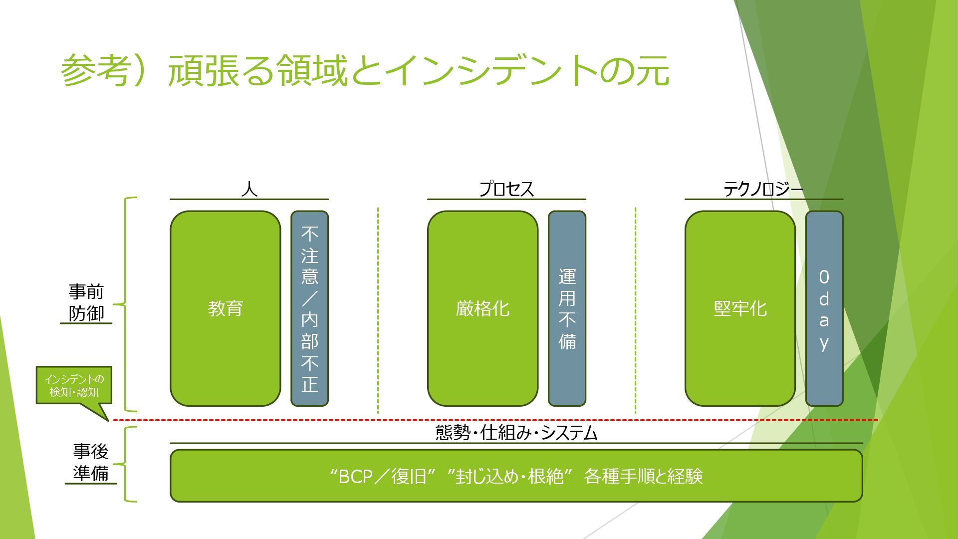 不 正 ⼈ 厳格化 運 ⽤ 不 備 プロセス 堅牢化 0 d a y テクノロジー “BCP/復旧” ”封じ込め・根絶” 各種⼿順と経験 事前 防御 事後 準備 インシデント インシデント インシデント インシデント インシデント インシデント 態勢・仕組み・システム インシデントの 検知・認知