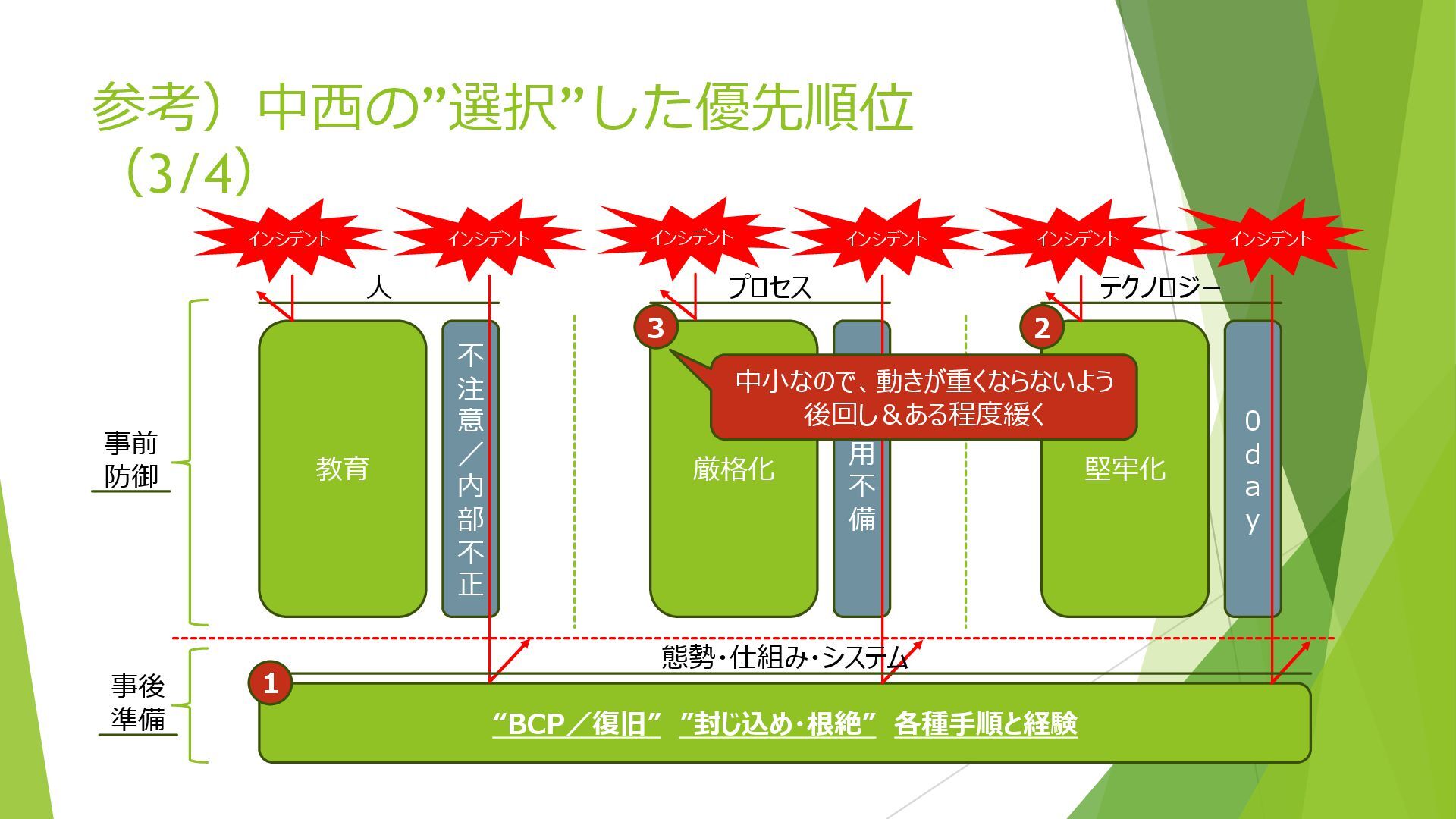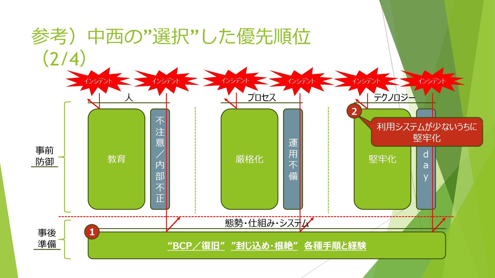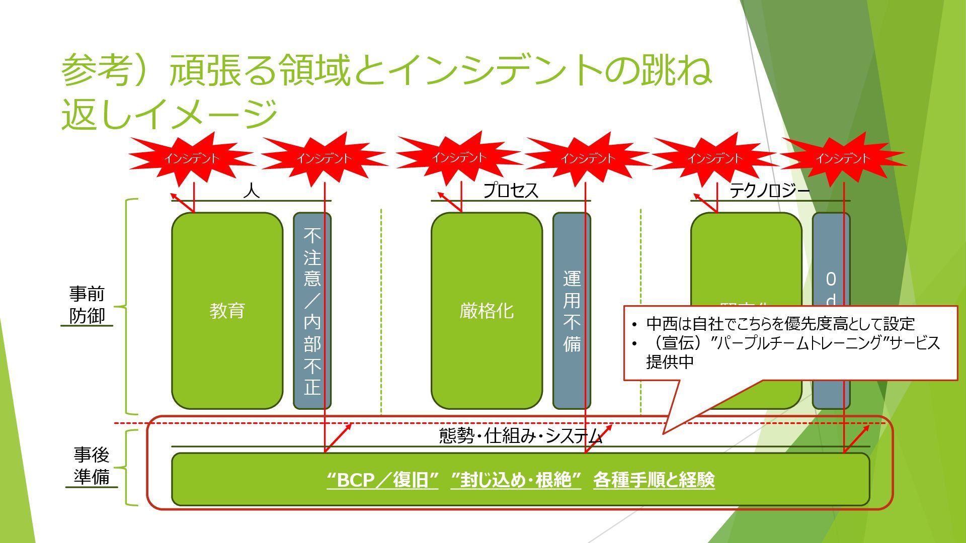 不 正 ⼈ 厳格化 運 ⽤ 不 備 プロセス 堅牢化 0 d a y テクノロジー “BCP/復旧” ”封じ込め・根絶” 各種⼿順と経験 事前 防御 事後 準備 インシデント インシデント インシデント インシデント インシデント インシデント 態勢・仕組み・システム • 中⻄は⾃社でこちらを優先度⾼として設定 • (宣伝)”パープルチームトレーニング”サービス 提供中