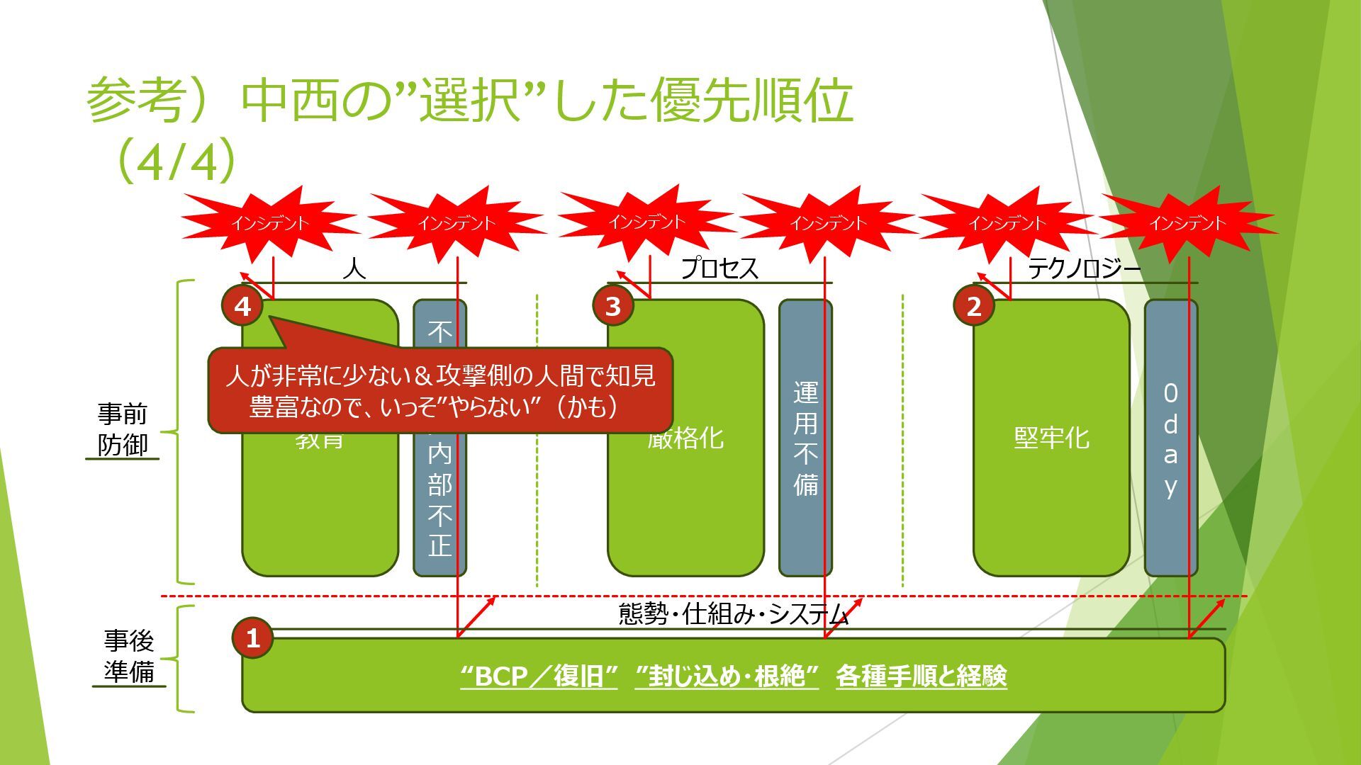 不 正 ⼈ 厳格化 運 ⽤ 不 備 プロセス 堅牢化 0 d a y テクノロジー “BCP/復旧” ”封じ込め・根絶” 各種⼿順と経験 事前 防御 事後 準備 インシデント インシデント インシデント インシデント インシデント インシデント 態勢・仕組み・システム 1 ⼈が⾮常に少ない&攻撃側の⼈間で知⾒ 豊富なので、いっそ”やらない”(かも) 2 3 4