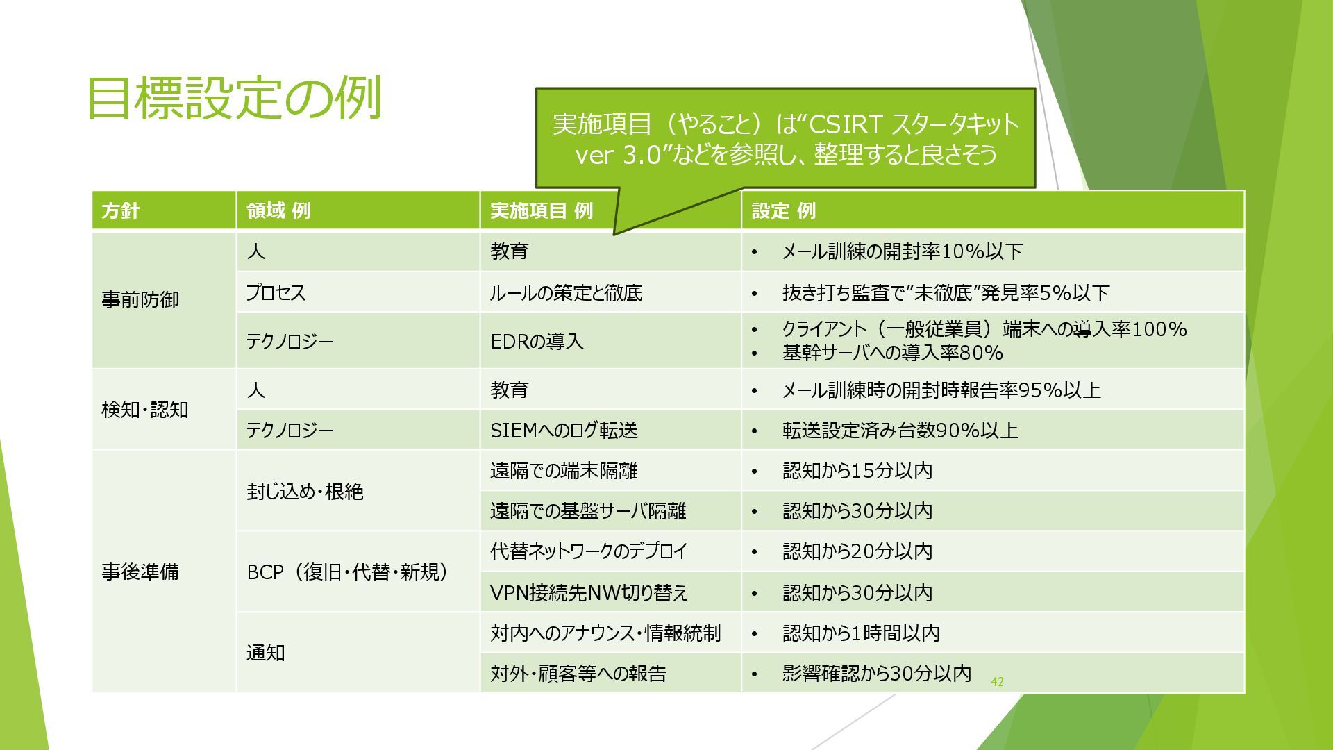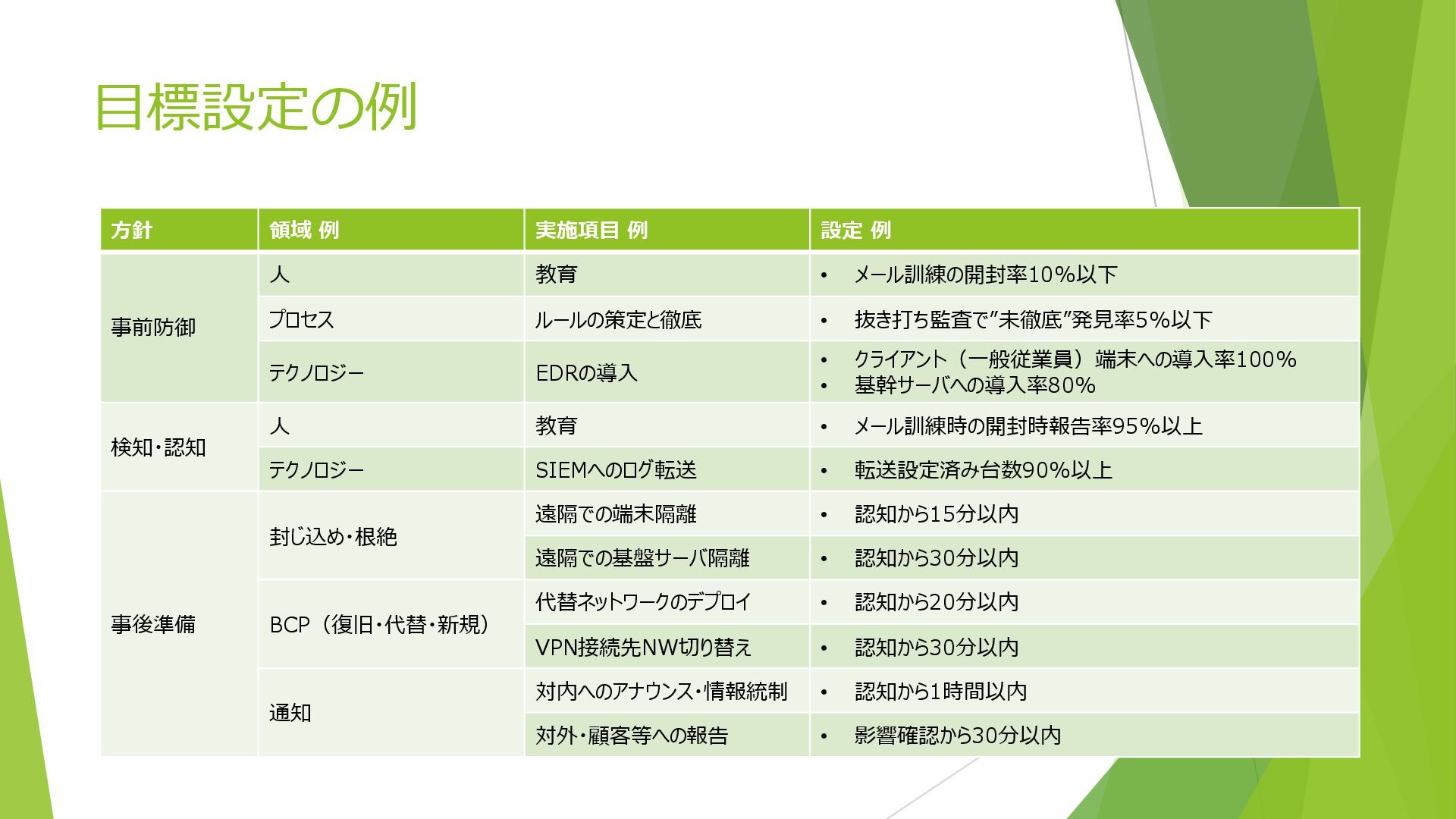⼈ 教育 • メール訓練の開封率10%以下 プロセス ルールの策定と徹底 • 抜き打ち監査で”未徹底”発⾒率5%以下 テクノロジー EDRの導⼊ • クライアント(⼀般従業員)端末への導⼊率100% • 基幹サーバへの導⼊率80% 検知・認知 ⼈ 教育 • メール訓練時の開封時報告率95%以上 テクノロジー SIEMへのログ転送 • 転送設定済み台数90%以上 事後準備 封じ込め・根絶 遠隔での端末隔離 • 認知から15分以内 遠隔での基盤サーバ隔離 • 認知から30分以内 BCP(復旧・代替・新規) 代替ネットワークのデプロイ • 認知から20分以内 VPN接続先NW切り替え • 認知から30分以内 通知 対内へのアナウンス・情報統制 • 認知から1時間以内 対外・顧客等への報告 • 影響確認から30分以内