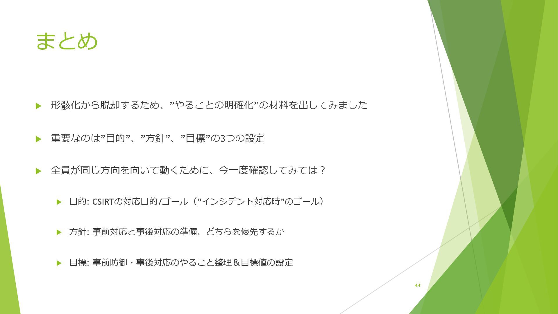 まとめ u 形骸化から脱却するため、”やることの明確化”の材料を出してみました u 重要なのは”⽬的”、”⽅針”、”⽬標”の3つの設定 u 全員が同じ⽅向を向いて動くために、今⼀度確認してみては︖ u ⽬的: CSIRTの対応⽬的/ゴール(”インシデント対応時”のゴール)