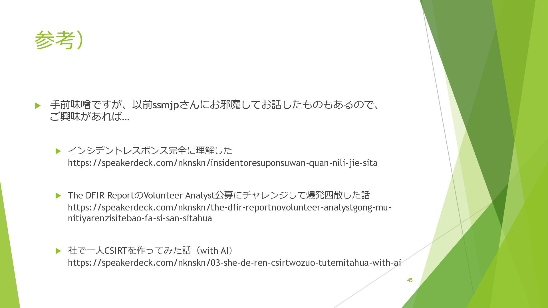 ReportのVolunteer Analyst公募にチャレンジして爆発四散した話 https://speakerdeck.com/nknskn/the-dfir-reportnovolunteer-analystgong-mu- nitiyarenzisitebao-fa-si-san-sitahua u 社で⼀⼈CSIRTを作ってみた話(with AI) https://speakerdeck.com/nknskn/03-she-de-ren-csirtwozuo-tutemitahua-with-ai 45