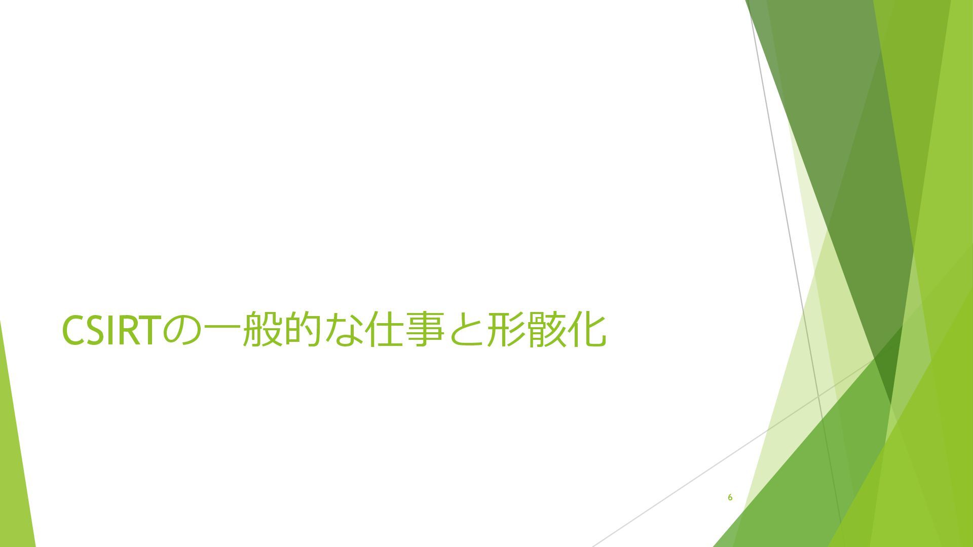 はじめに u 簡単に出来たら苦労しないのは重々承知の上で、いろいろ端折って簡単に書い ています u 作りながら「簡単にできたら苦労しねーよ」と何回もため息をつきました… u CSIRTの仕事は多岐にわたり、そしてリソースは限られているため、 「なにから⼿を付けるか」を決める際には、“選択”と”集中”が重要です u