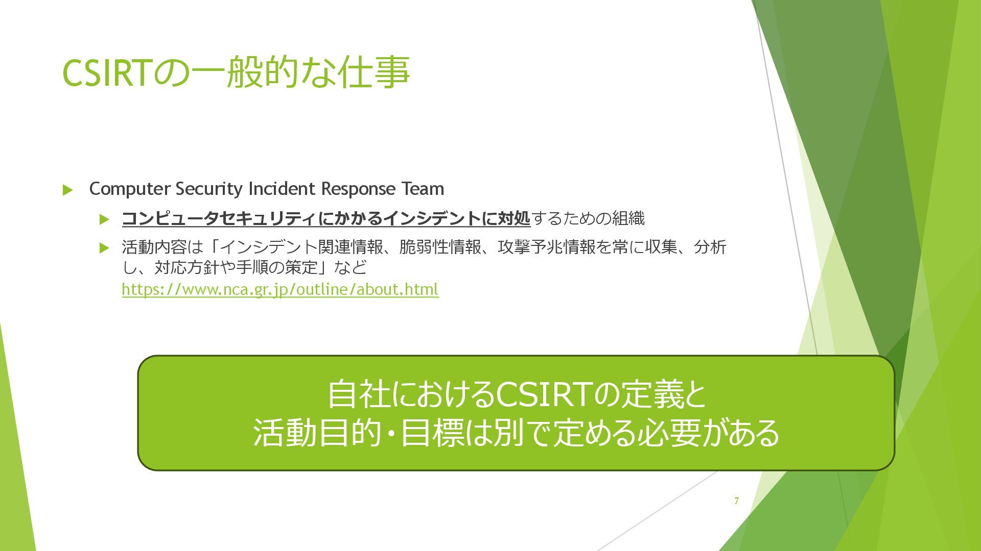 CSIRTの⼀般的な仕事 u Computer Security Incident Response Team u コンピュータセキュリティにかかるインシデントに対処するための組織 u