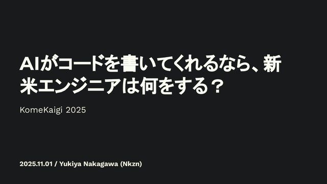 AIがコードを書いてくれるなら、新 米エンジニアは何をする? 2025.11.01 / Yukiya Nakagawa (Nkzn) KomeKaigi 2025