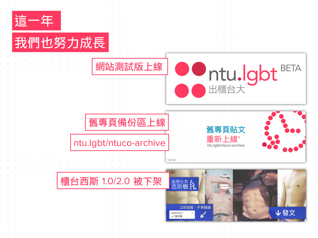 這㆒年 網站測試版㆖線 舊專頁備份區㆖線 ntu.lgbt/ntuco-archive 櫃台西斯 1.0/2.0 被㆘架 我們也努力成長