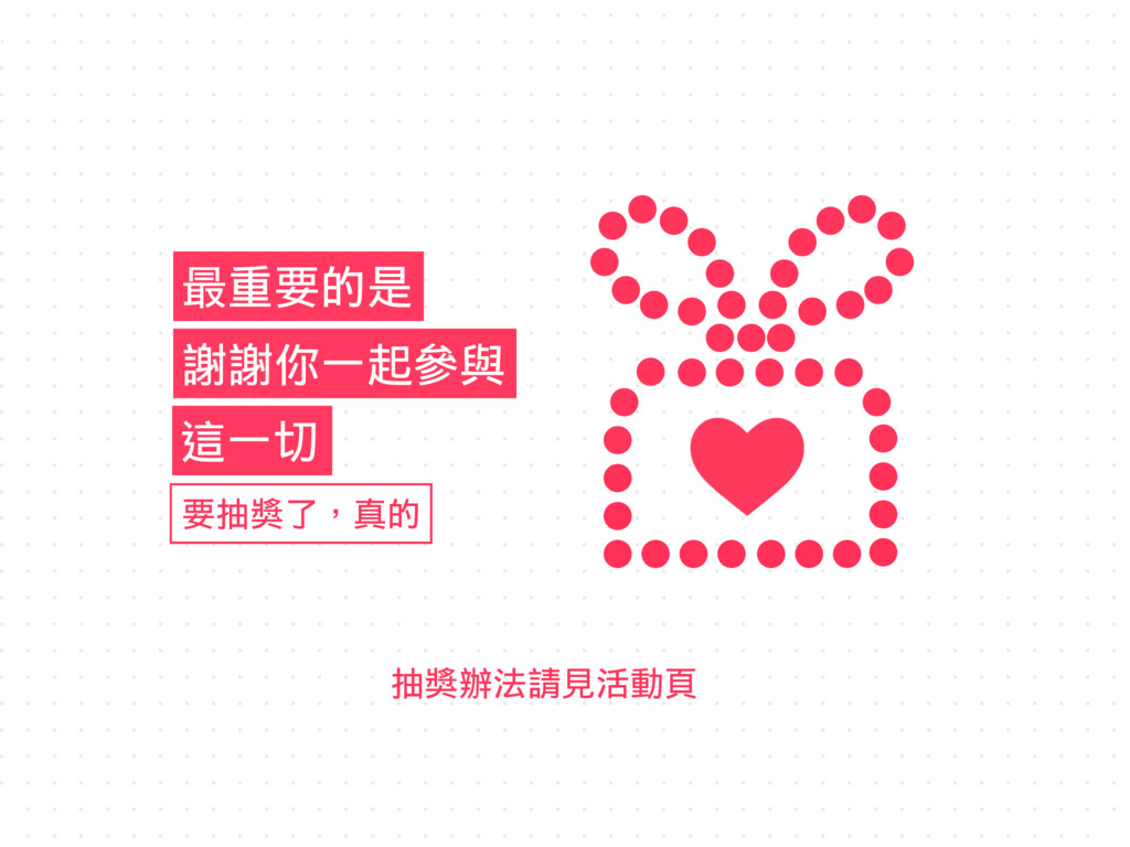 最重要的是 謝謝你㆒起參與 這㆒切 要抽獎了,真的 抽獎辦法請見活動頁