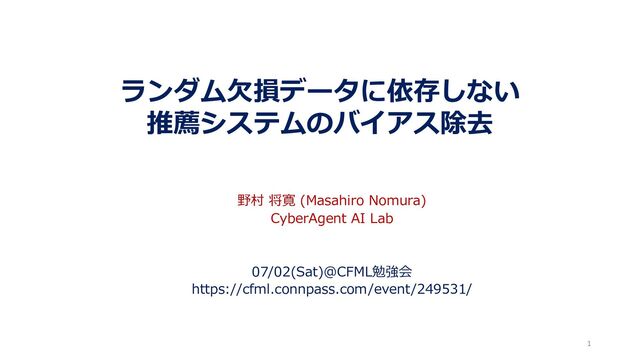 ランダム⽋損データに依存しない 推薦システムのバイアス除去 野村 将寛 (Masahiro Nomura) CyberAgent AI Lab 07/02(Sat)@CFML勉強会