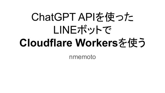 Completions API (ChatGPT API) ▪ これまでの会話の内容をコンテキストと して入力 ◦ Workers単体で永続化の仕組みはない • LINEからのWebhook送信に対して1秒以内の応答 → Cloudflare Queues ◦ Webhook受信に関するLINEの仕様 ▪ https://developers.line.biz/ja/docs/messaging-api/receiving-messages/#check-error-reason ◦ メッセージ投稿は別の API ▪ https://developers.line.biz/ja/docs/messaging-api/sending-messages/#reply-messages ◦ ChatGPT APIのレスポンスは1秒を超える curl https://api.openai.com/v1/chat/completions \ -H "Content-Type: application/json" \ -H "Authorization: Bearer $OPENAI_API_KEY" \ -d '{ "model": "gpt-3.5-turbo", "messages": [ {"role": "system", "content": "You are a helpful assistant."}, {"role": "user", "content": "Hello!"} ] }' https://platform.openai.com/docs/api-reference/chat/create