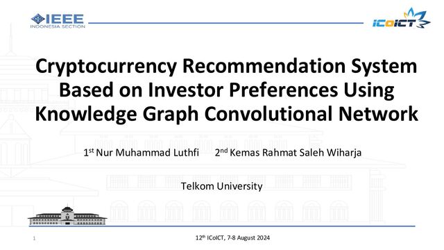 This presentation was presented at the 12th International Conference on Information and Communication Technology Bandung on 7 August 2024. It talked about my undergraduate thesis at Telkom University researching and building a recommender systems in the finance domain specifically in cryptocurrency. I took this topic because most of the research I found in the domain focused more on time-series analysis, creating a price prediction instead of portfolio creation.