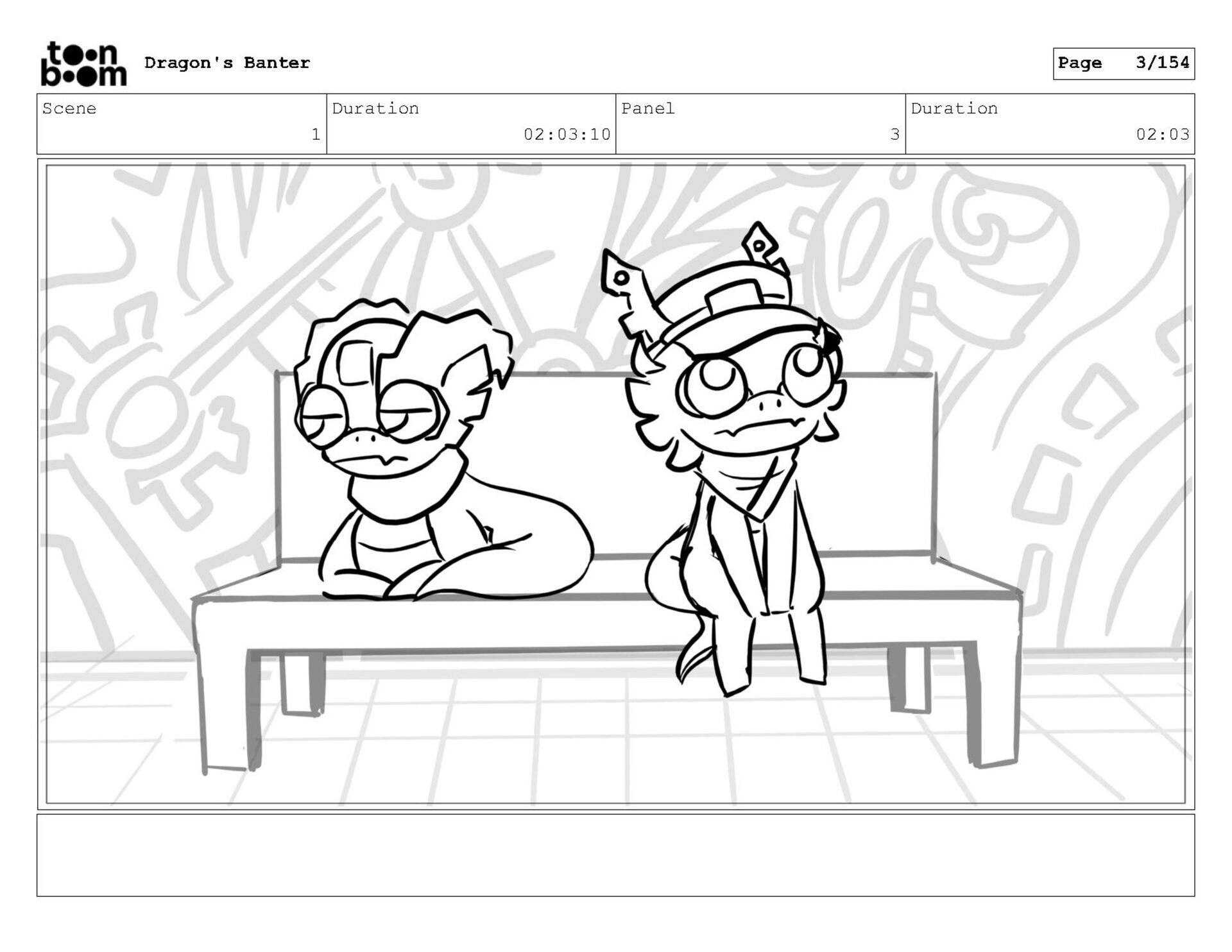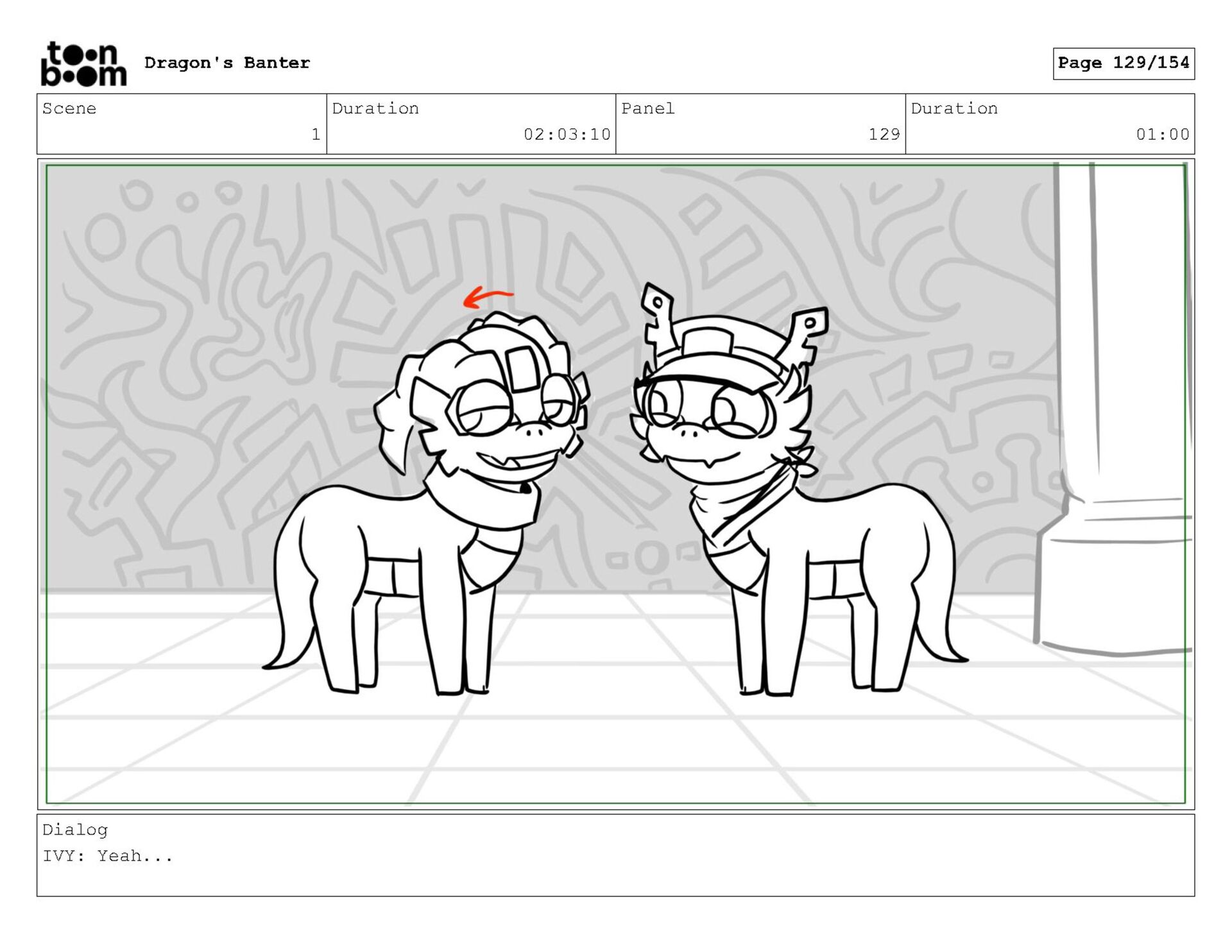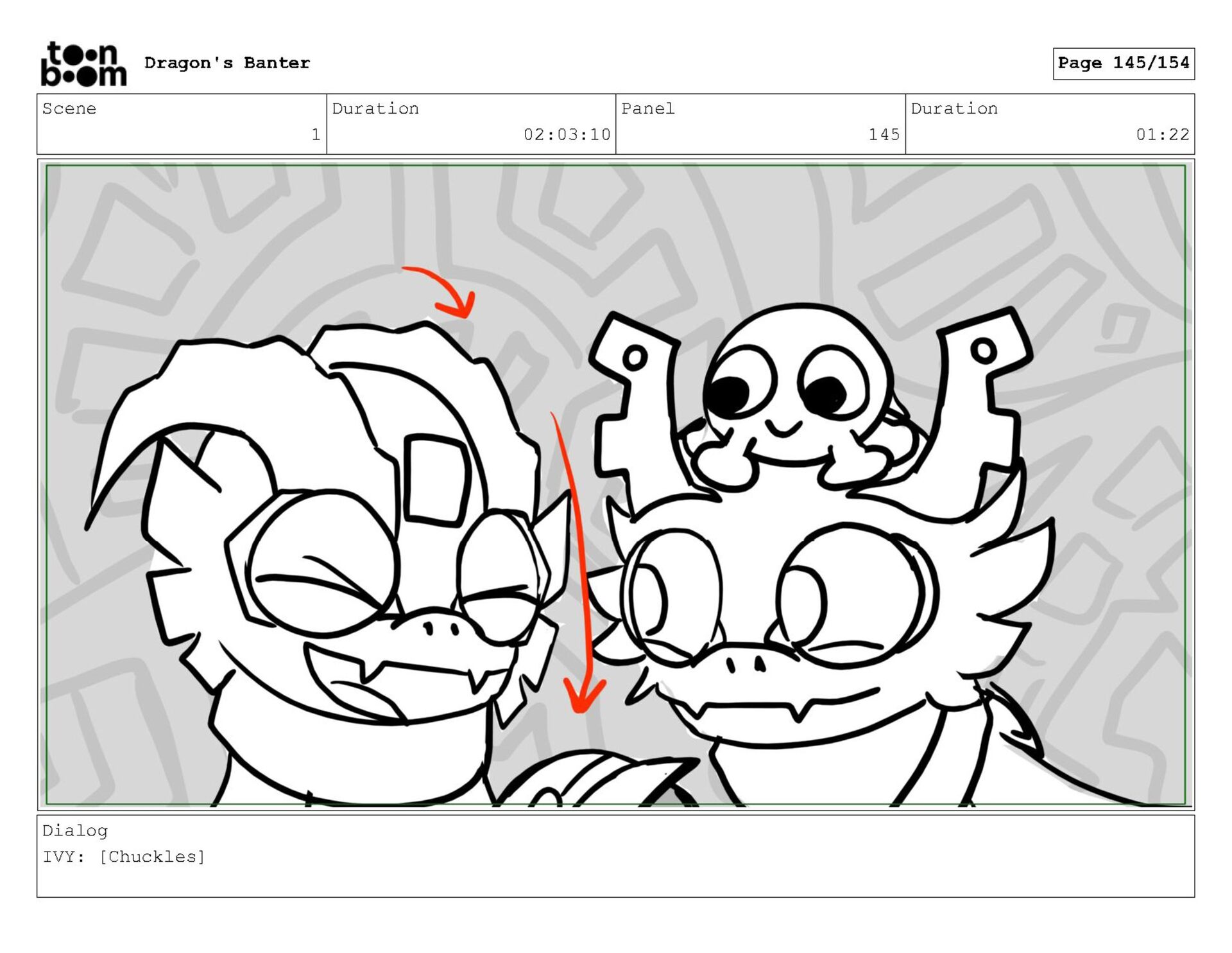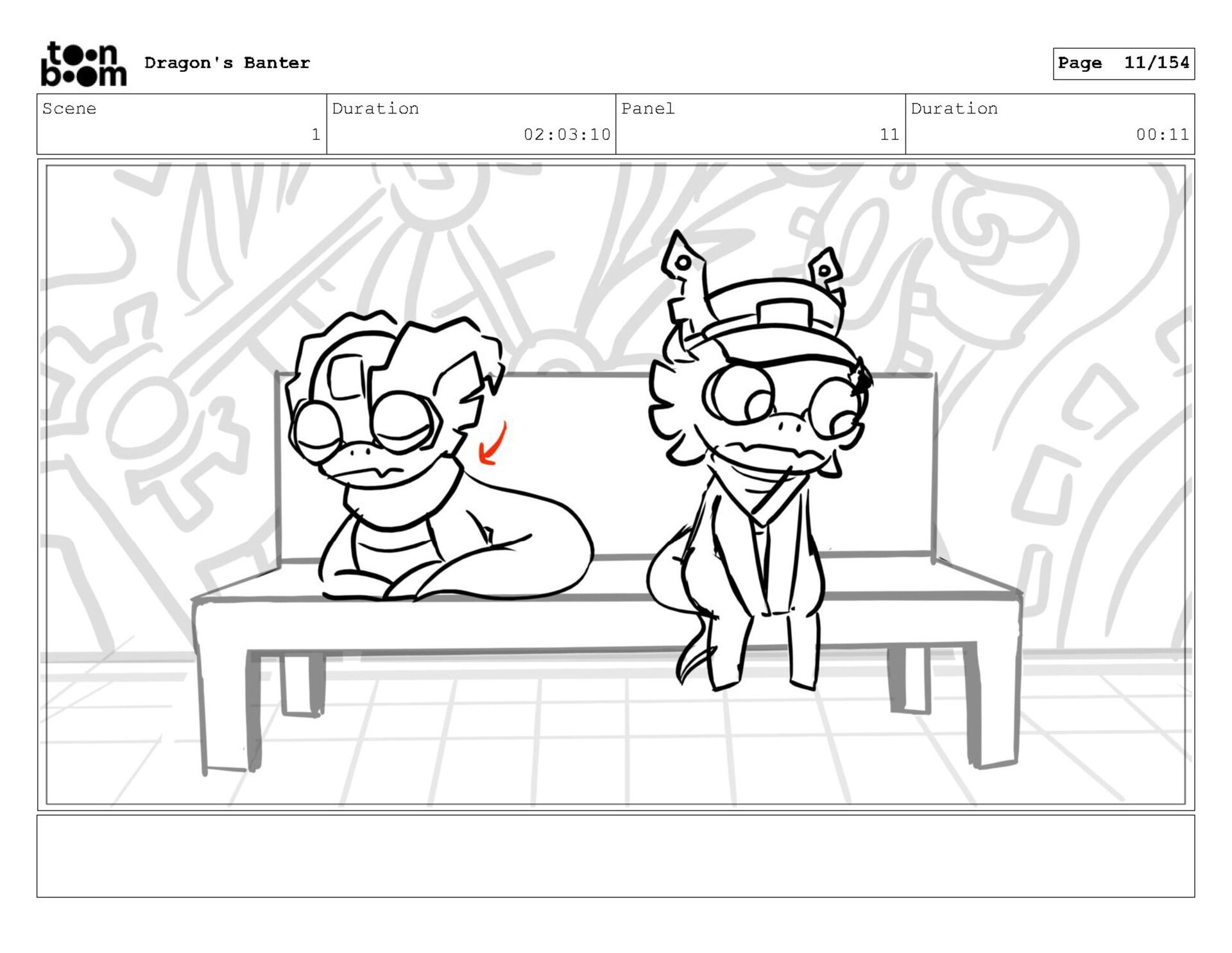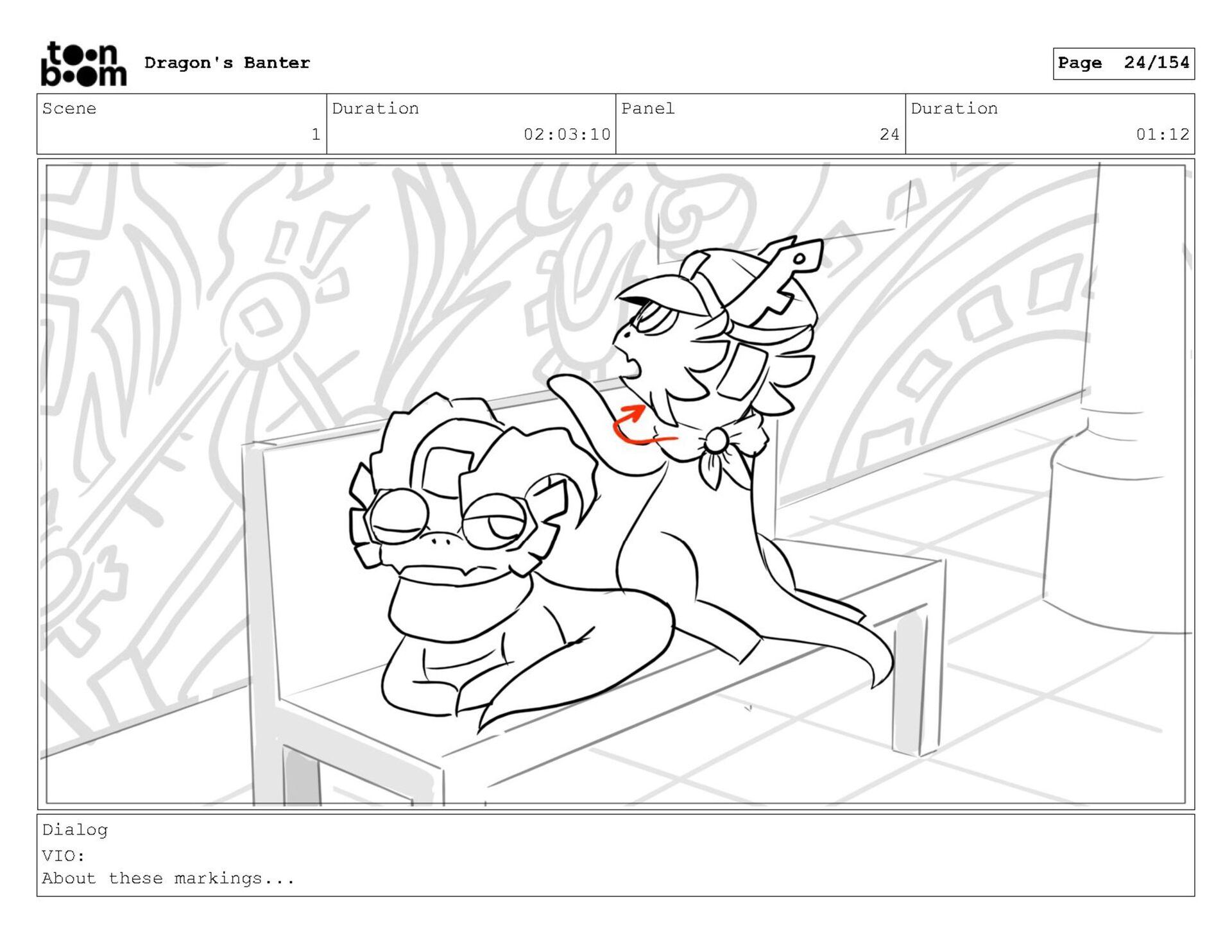 Storyboard produced for a University project, a comedic conversation exchange between two dragons about some fascinating markings on the walls. Featuring an original script and character designs.